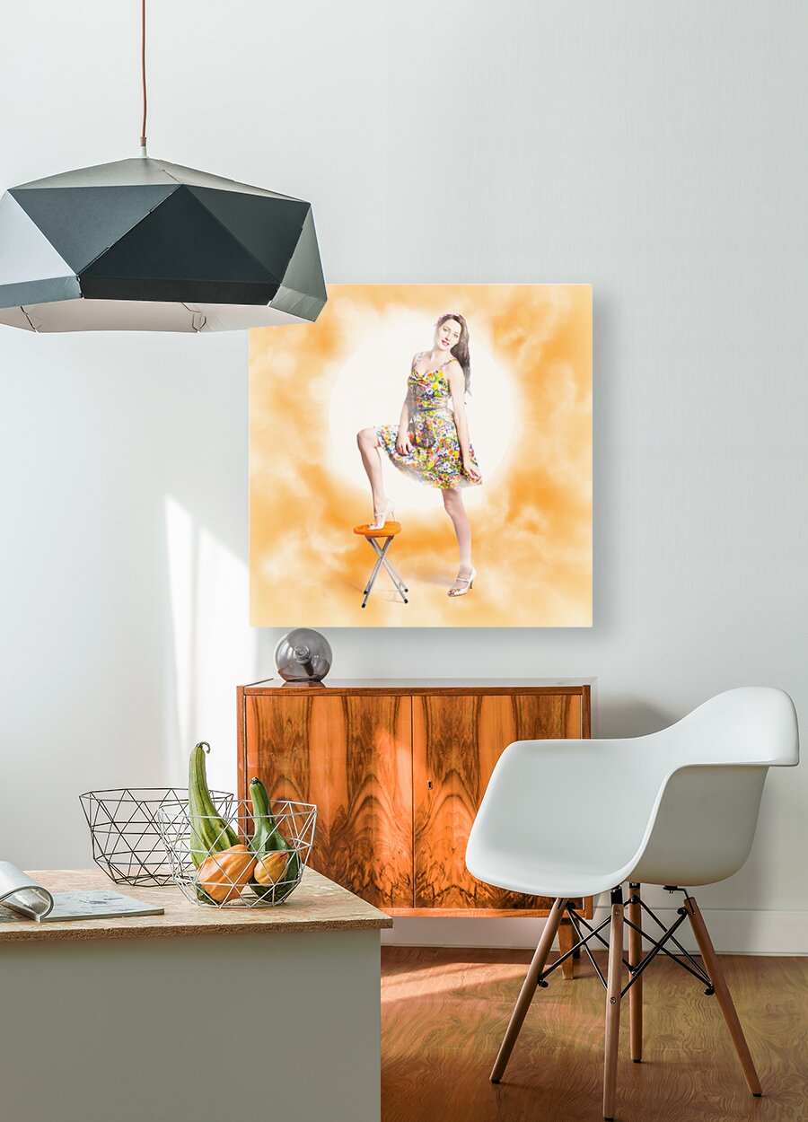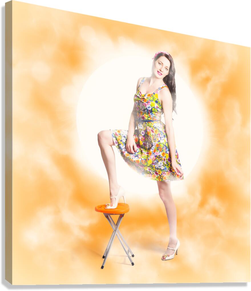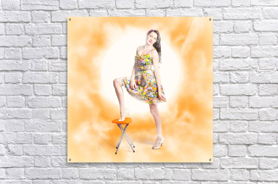 Vibrant beauty and fashion model standing on bar stool wearing floral dress with bright glam lights. Backlit pin-up beauty