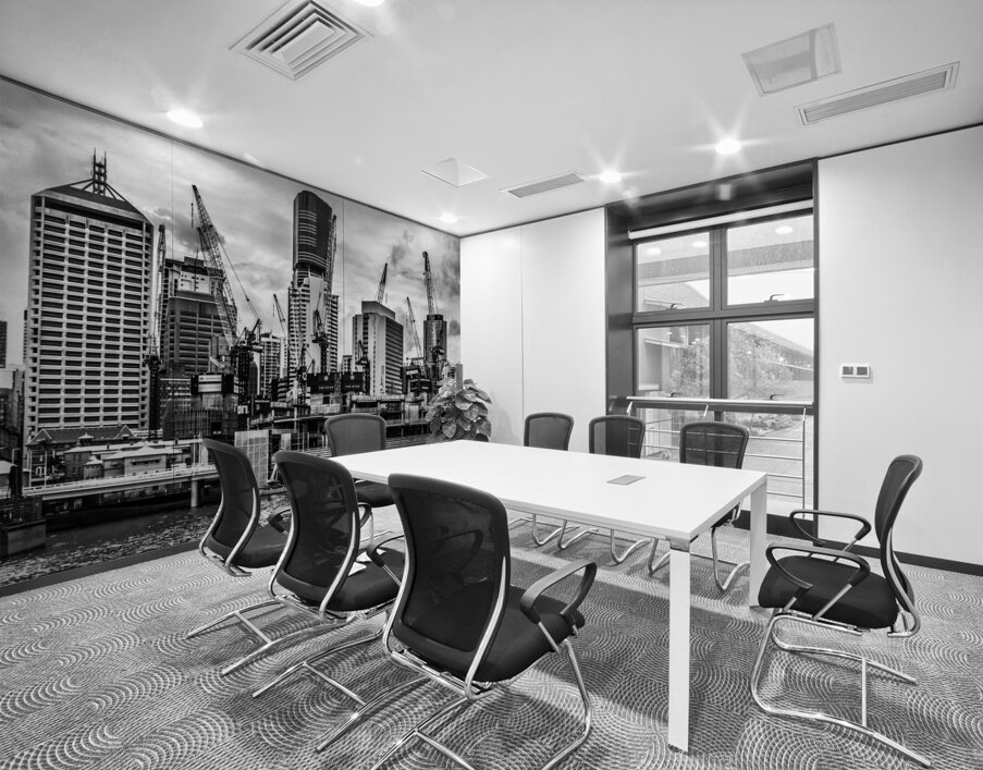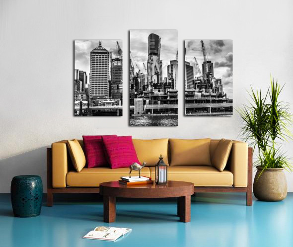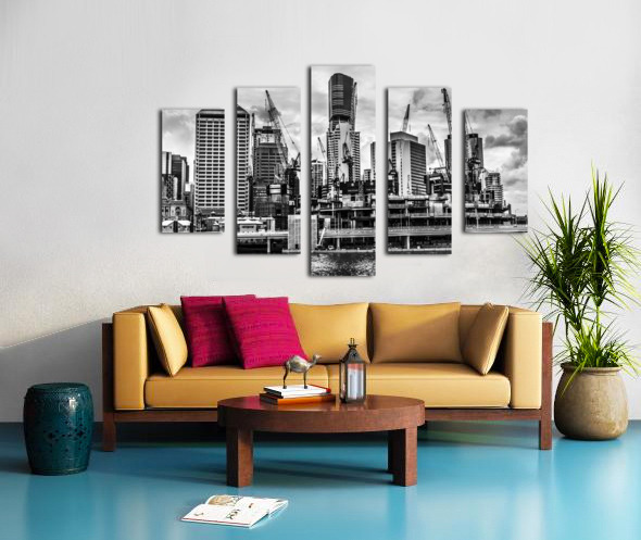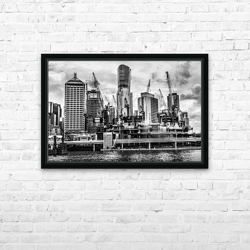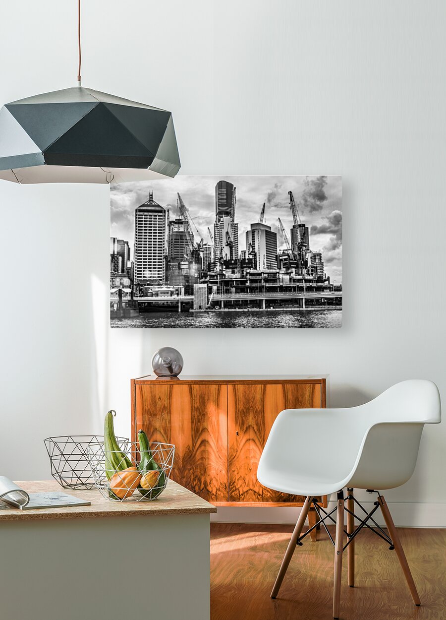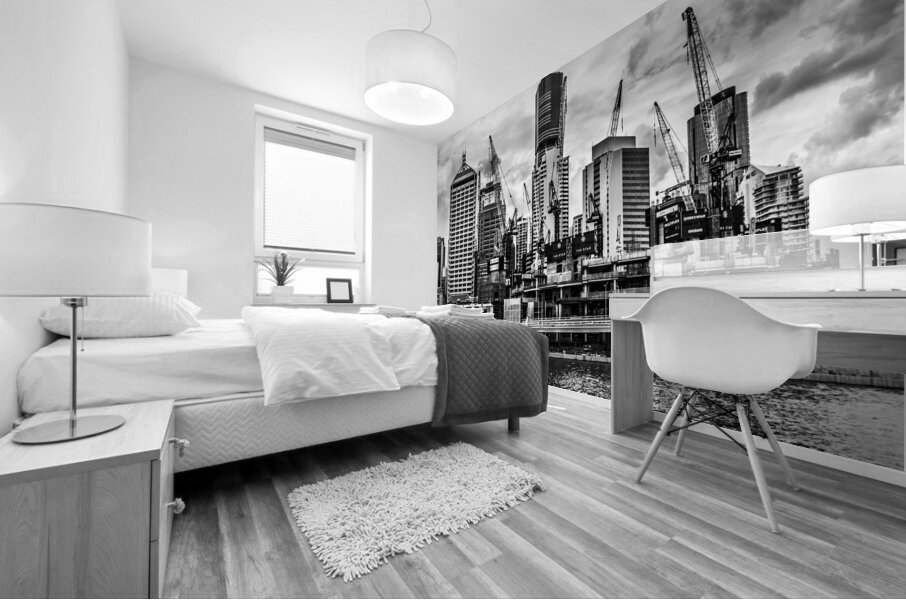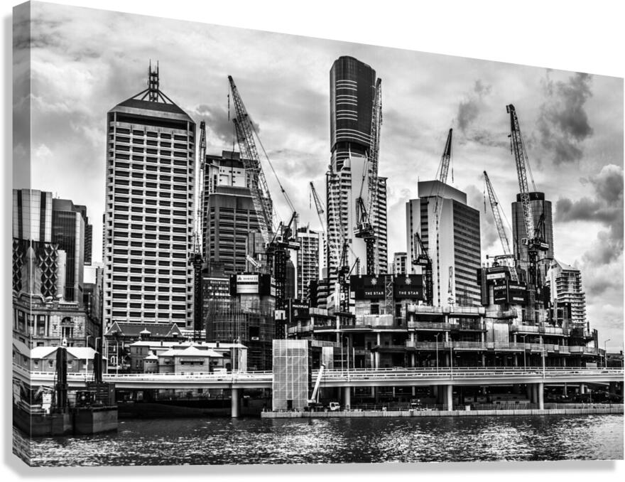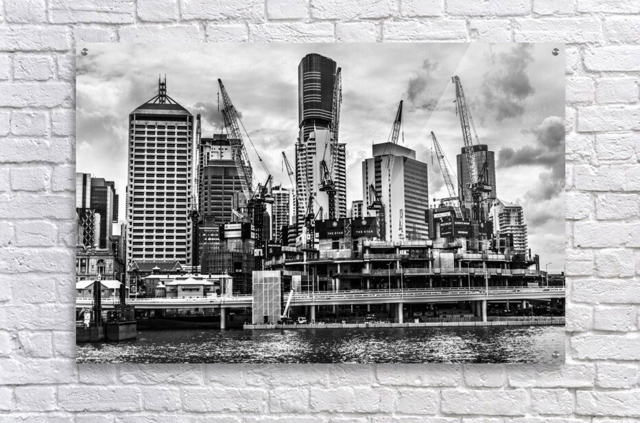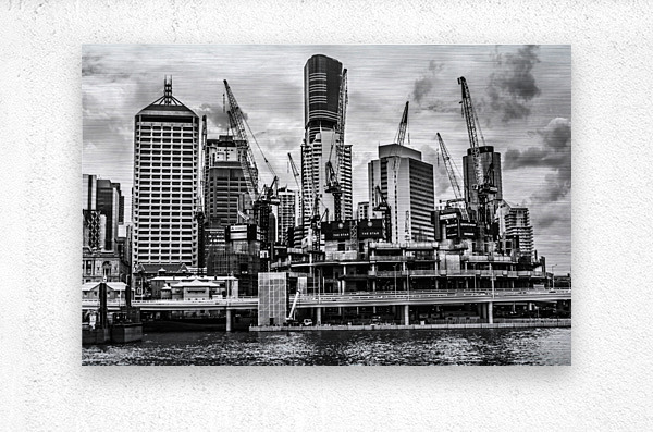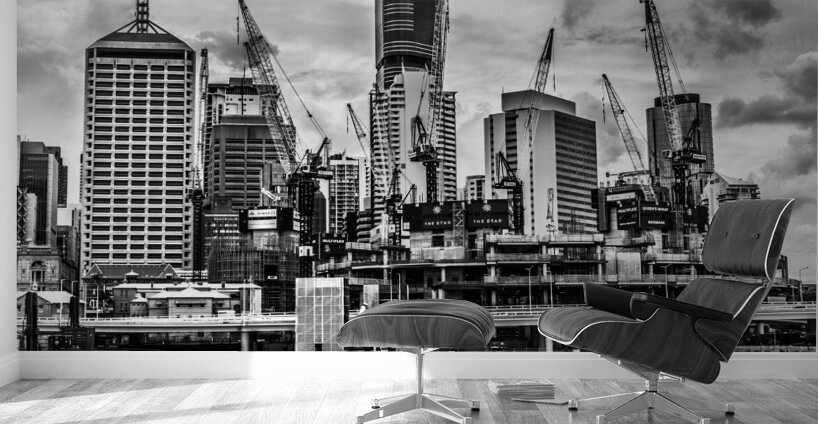 Creative architectural artwork on a building of metropolitan high rises with crane construction in black and white. Taken: Brisbane CBD Queensland Aus...[+]