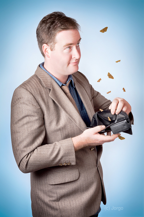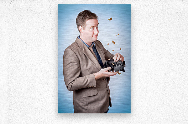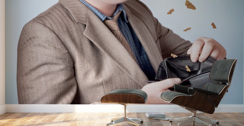Cheap and scungy male customer looking inside wallet with flying moths when finally making a discounted sale purchase