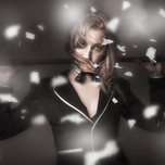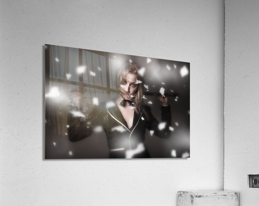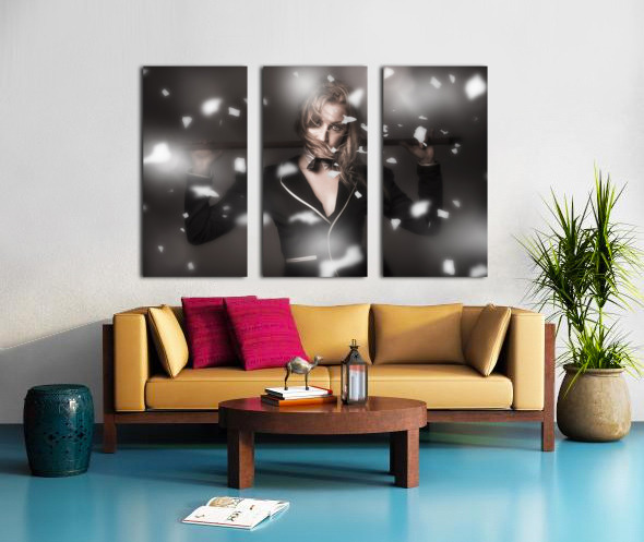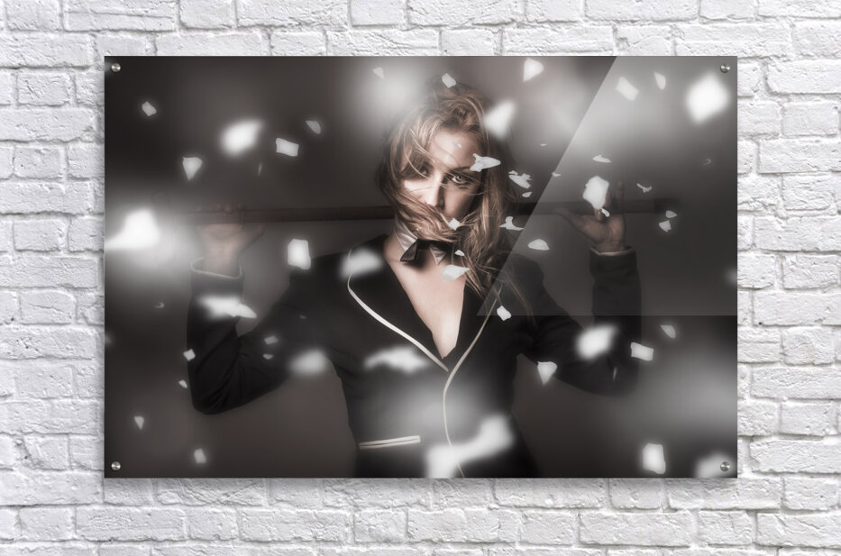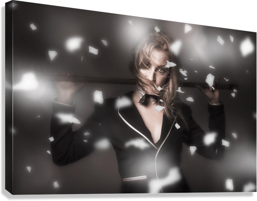 Dramatic entertainment portrait of a female showgirl performing on a theater stage in a barrage of movement. broadway cabaret show