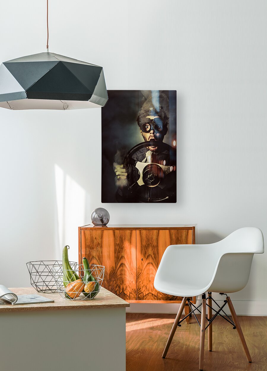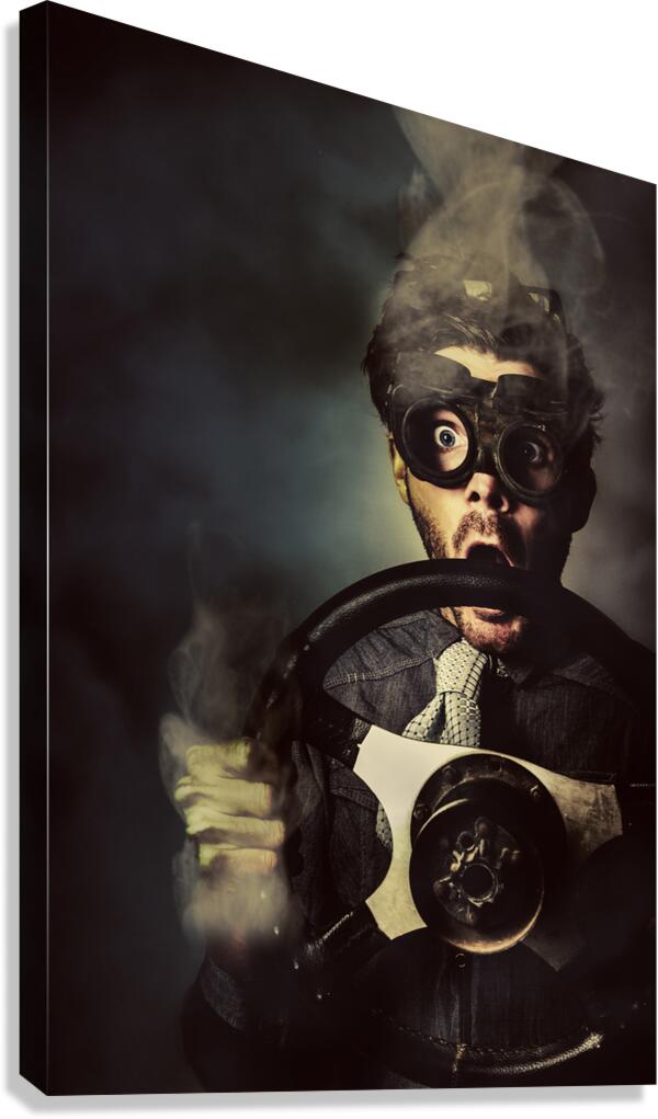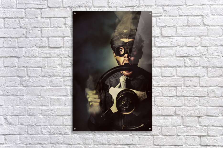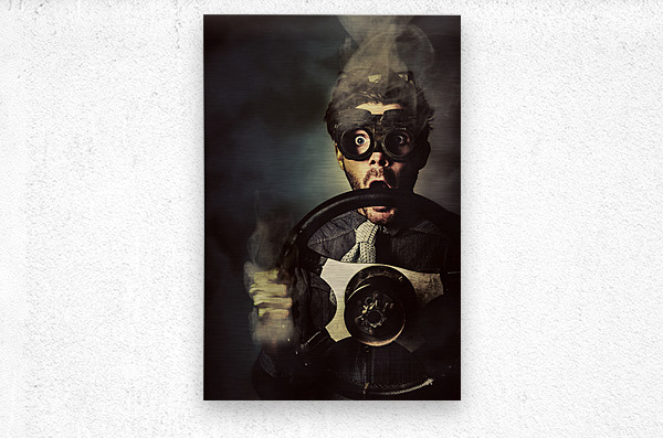 Dark creative concept portrait of a nerd business man holding steaming auto wheel during a fast pace race competition. Street racer