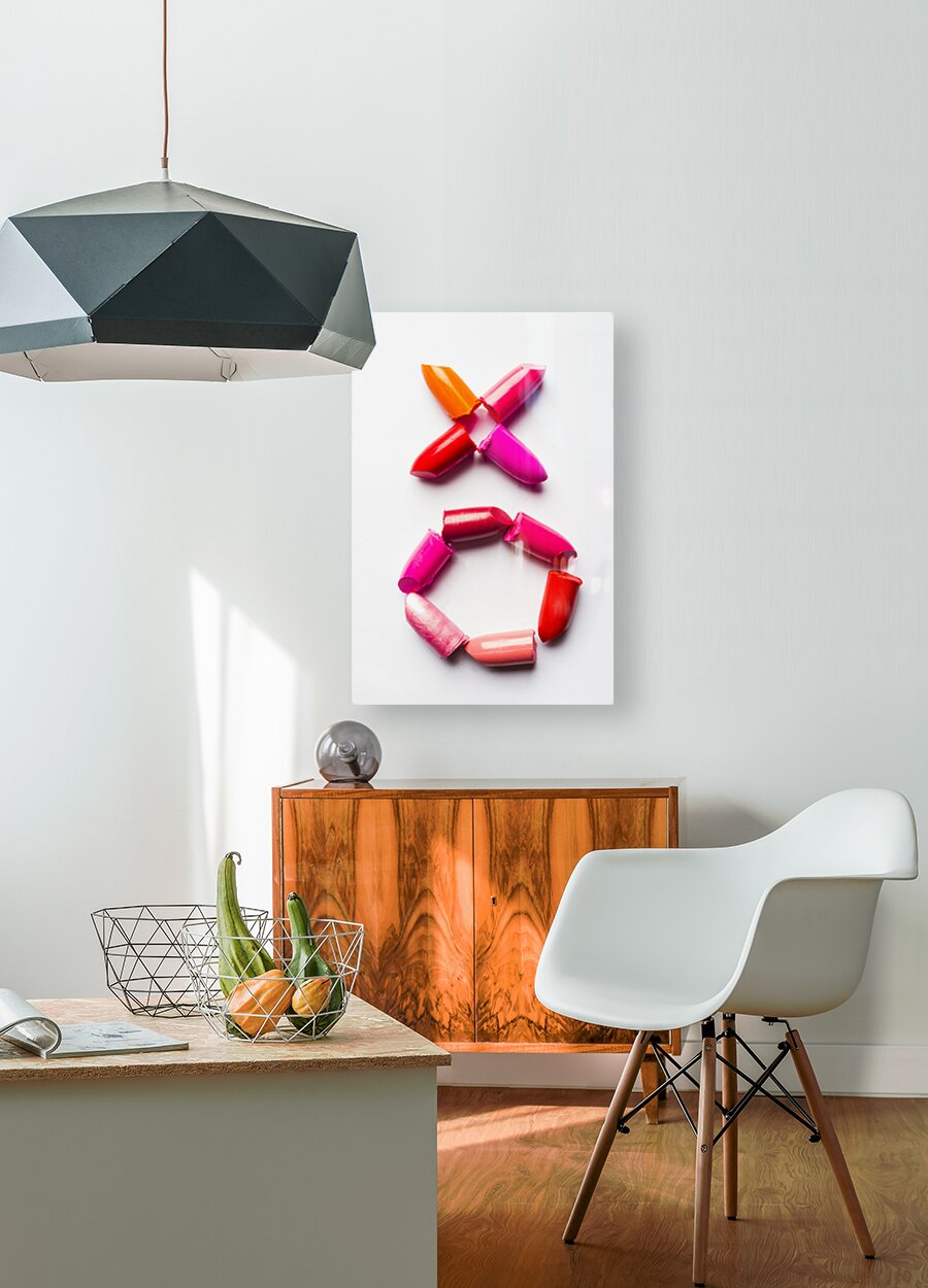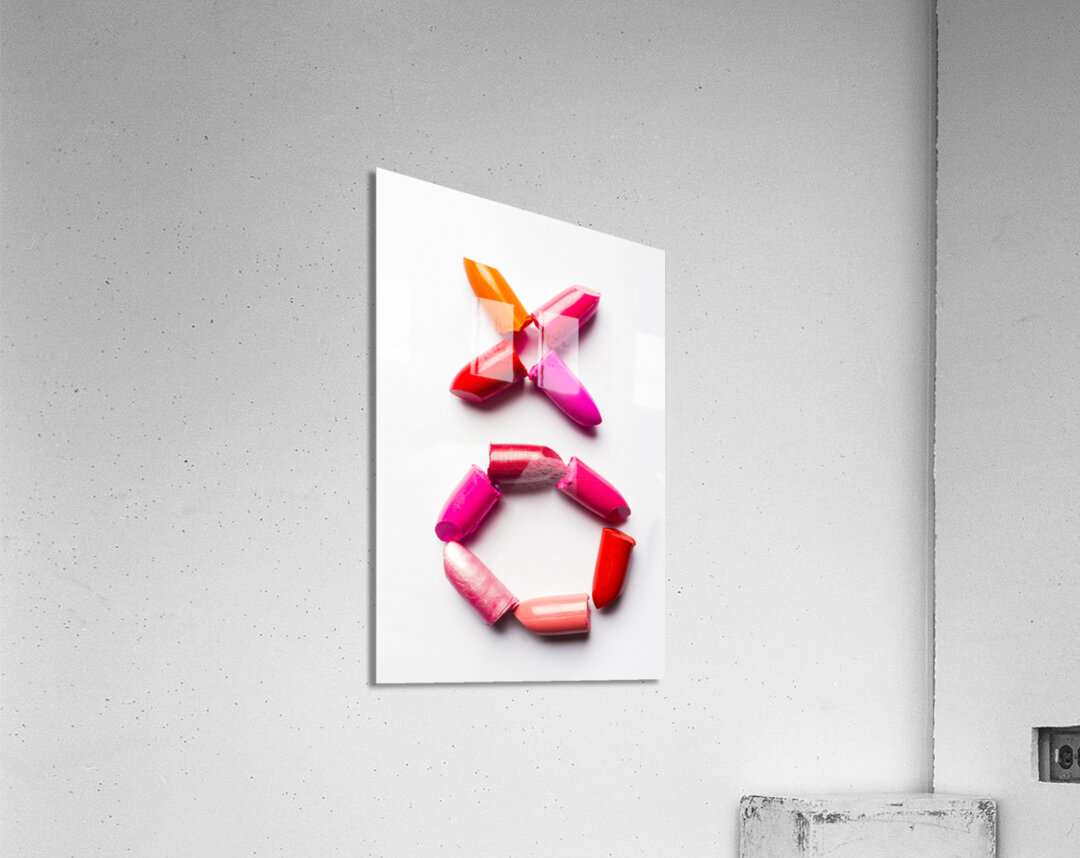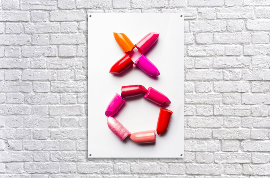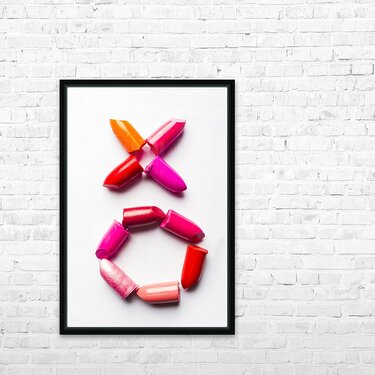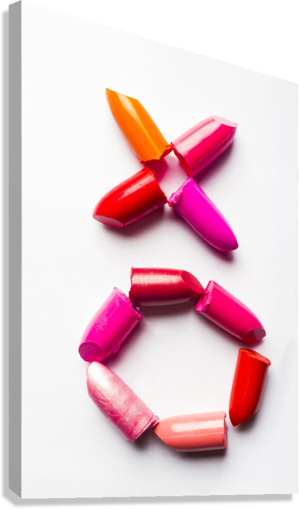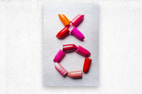 Fine art beauty photo on sliced up romance written with x and o in lipstick sentiment. Kiss and makeup