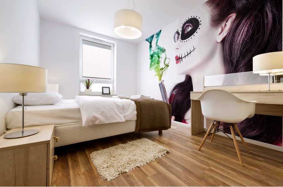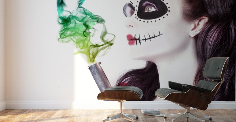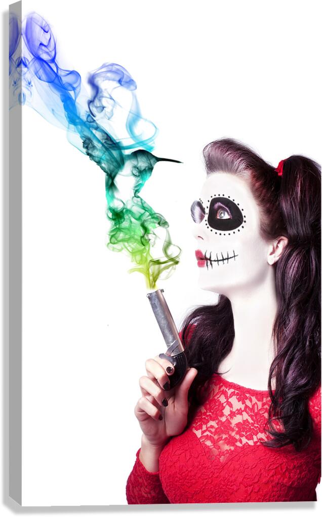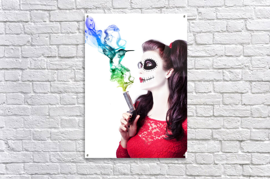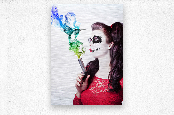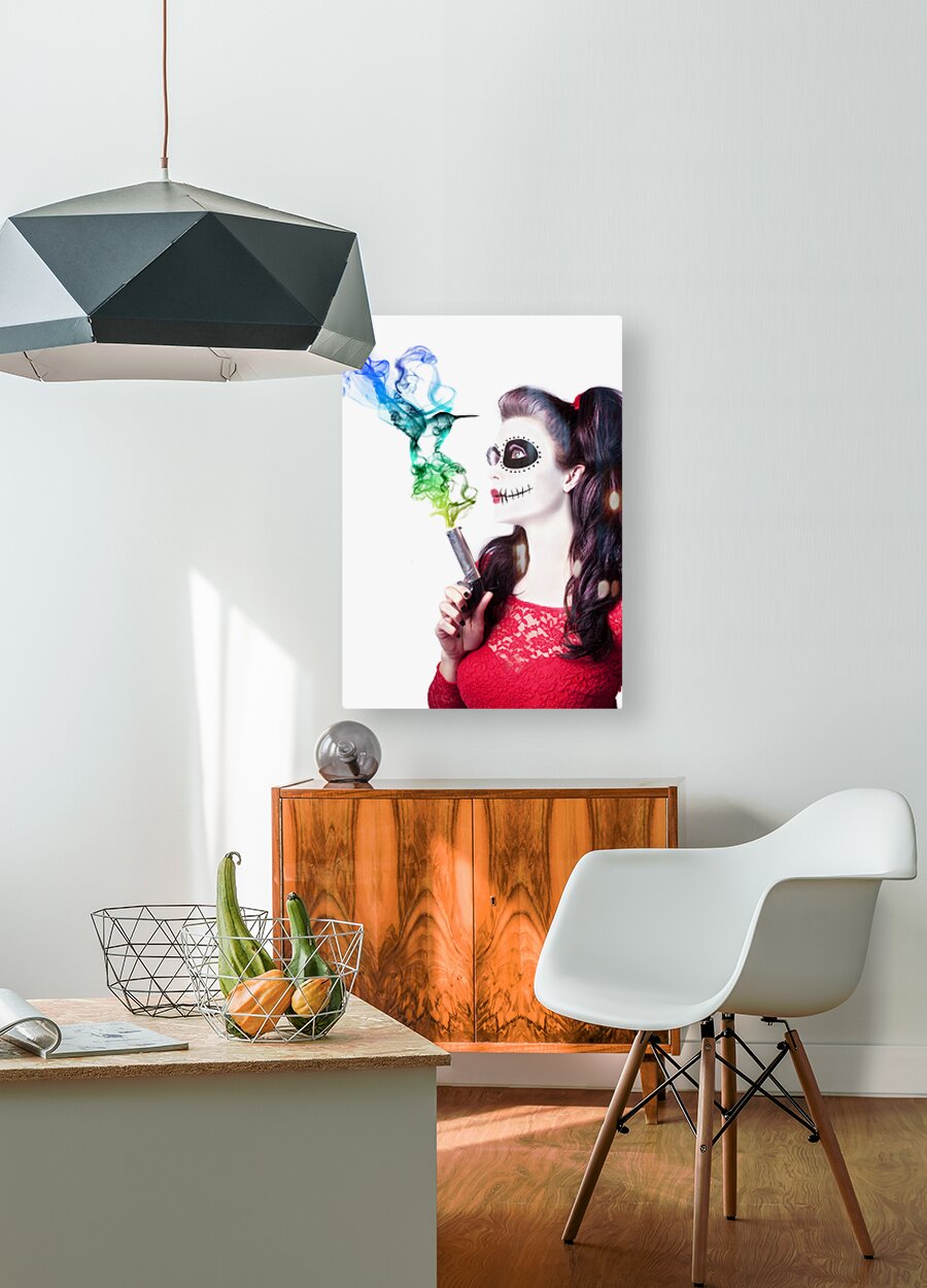 ABOUT THIS ARTWORK: SUGAR SKULL GIRL BLOWING ON SMOKING GUN