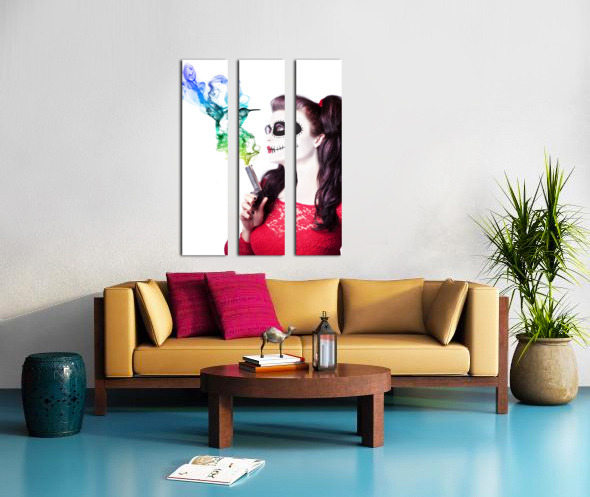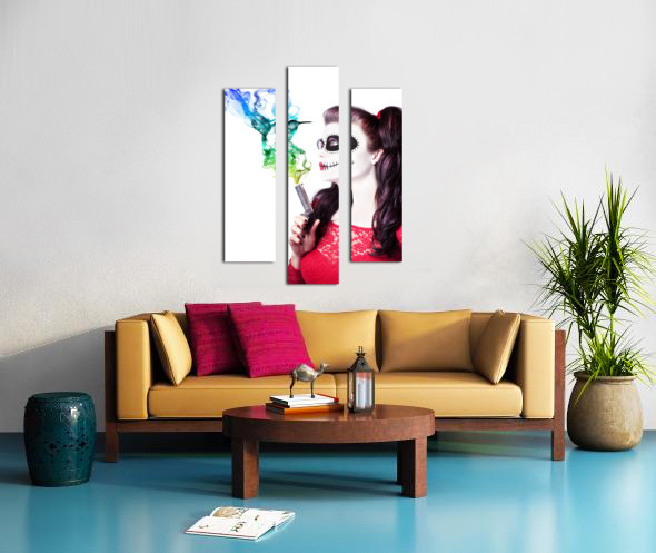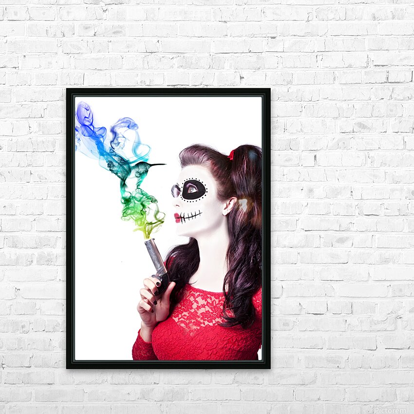 Sugar skull girl blowing on smoking gun Frame print