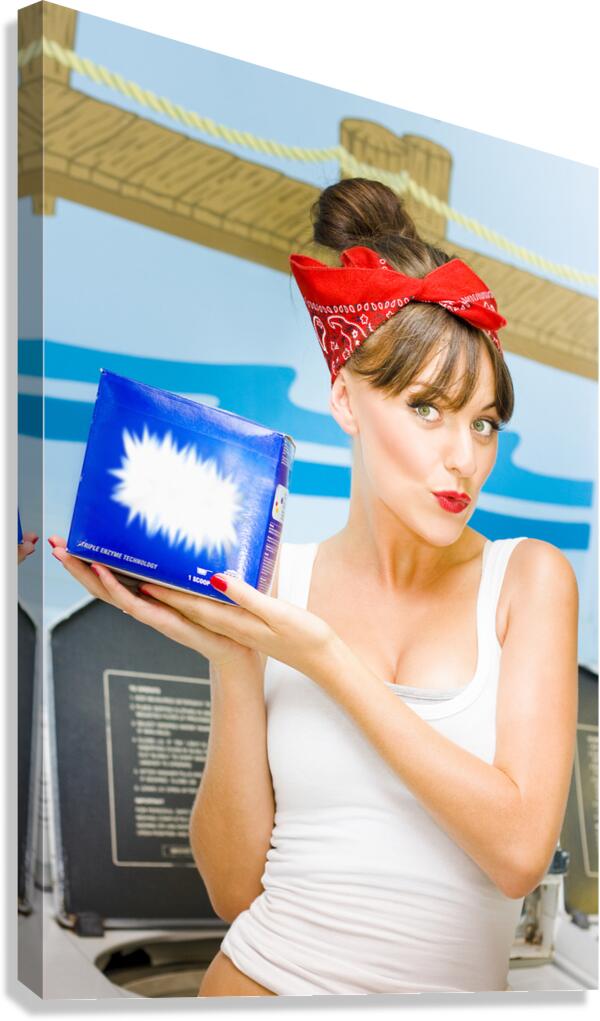 A Happy And Enthusiastic Woman Showcases A Box Of Laundry Powder While In The Process Of Doing Her Washing At Her Home In A Housework Concept