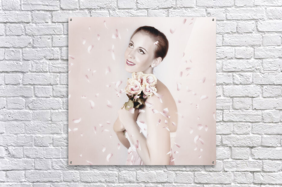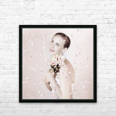 Soft Vintage Portrait Of A Beautiful Young Romantic Woman Holding Flowers In Hand As Delicate Petals Fall From The Sky