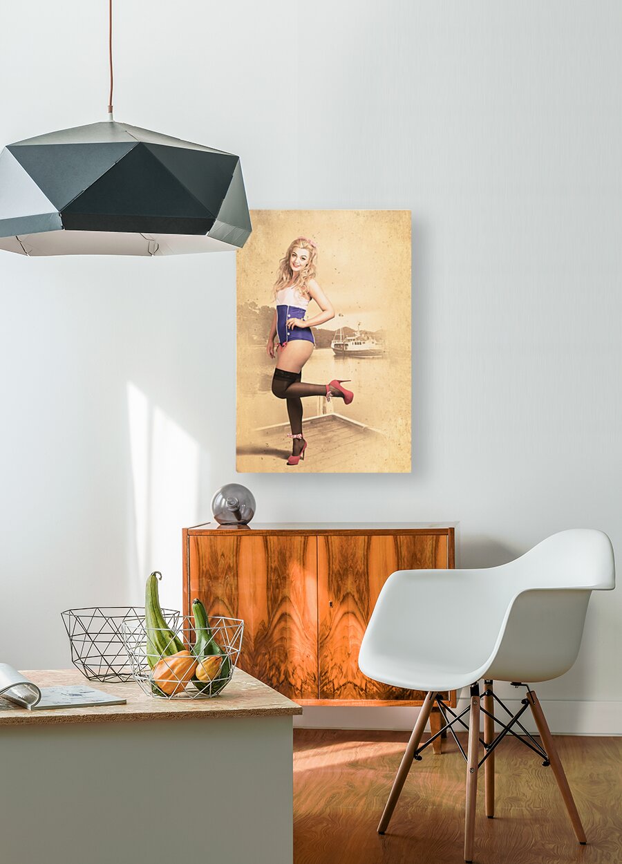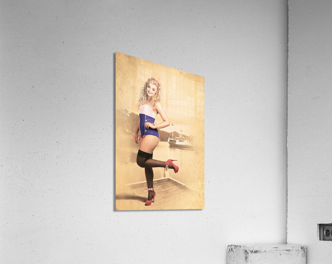Vintage maritime pinup portrait of a happy navy girl standing on old dock in pretty high heel shoes with pin-up styled blond hair tie. Retro fashion a...[+]