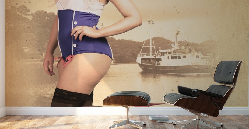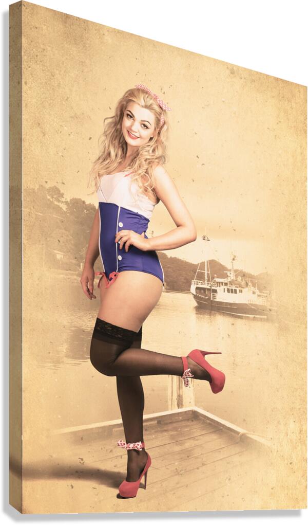 Vintage maritime pinup portrait of a happy navy girl standing on old dock in pretty high heel shoes with pin-up styled blond hair tie. Retro fashion and accessories