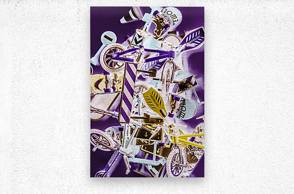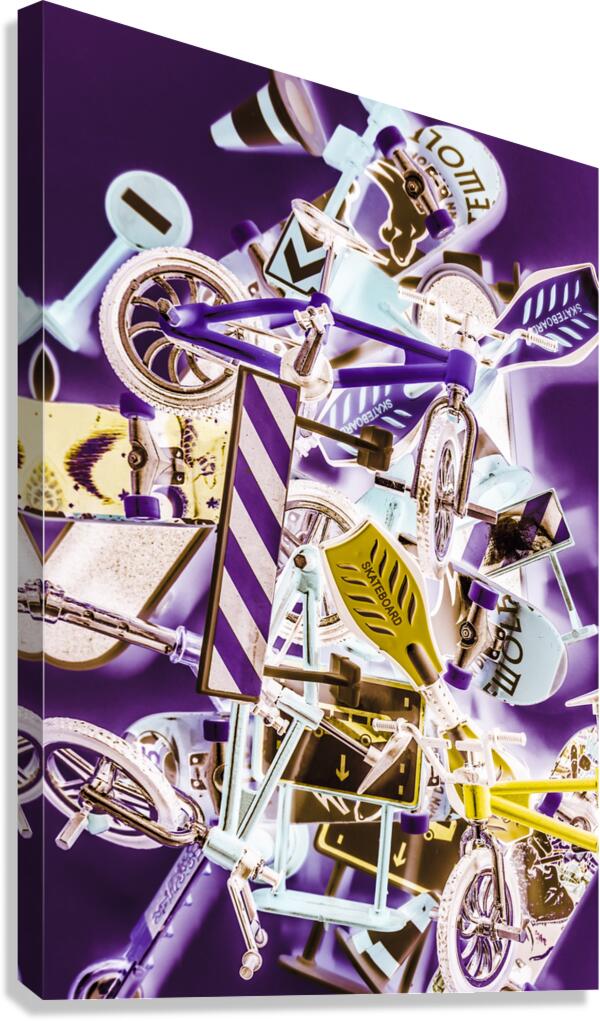 Street recreation in a entertaining mix of skateboarding biking and scooting on road signage. Extreme fun