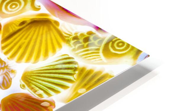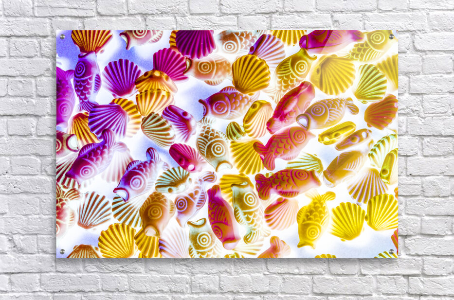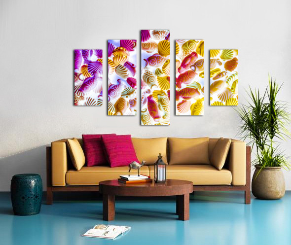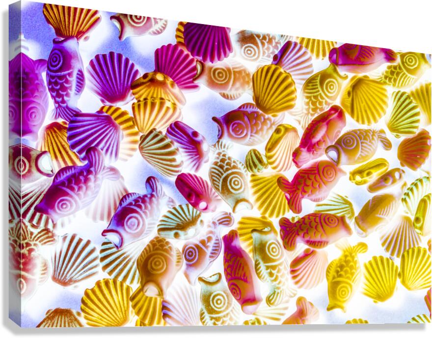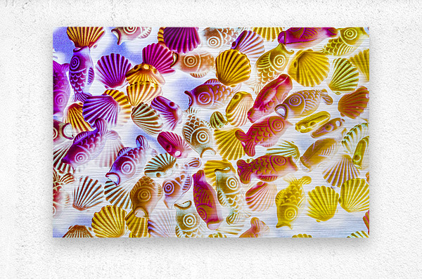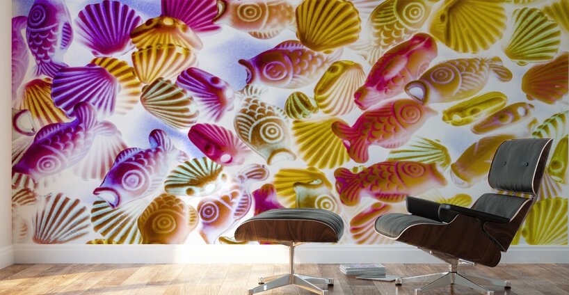Bright colorful marine theme on a aquatic mashup of fish and seaside shells. Decorocean