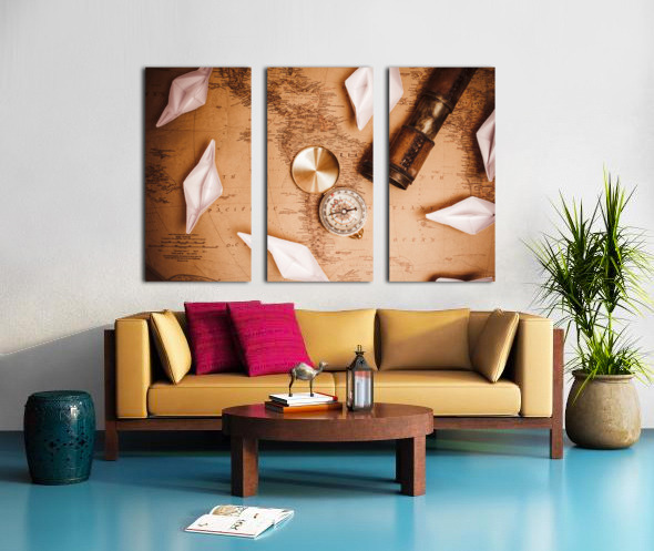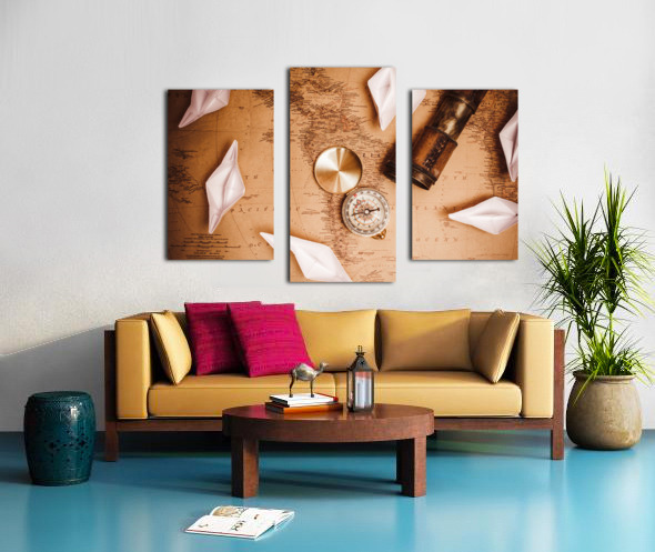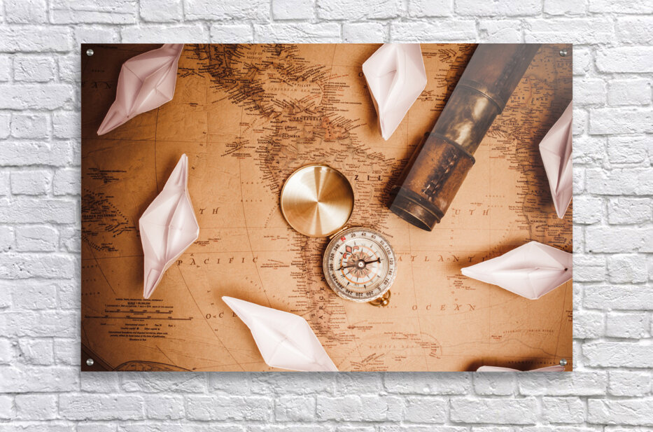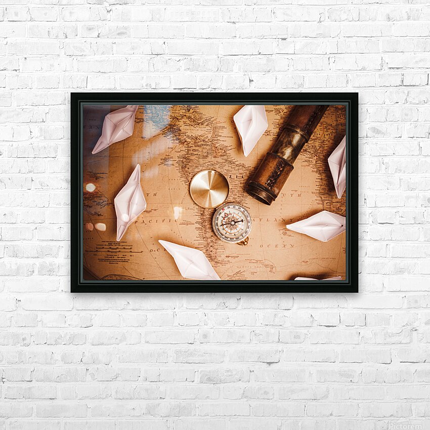 Explorer desk with compass map and spyglass Frame print