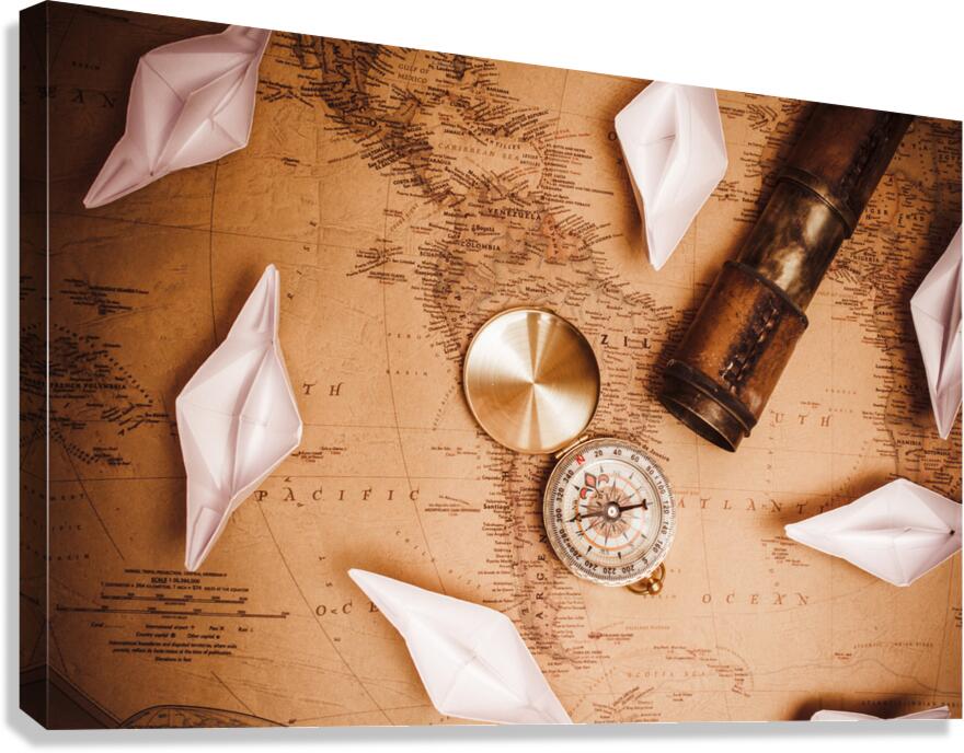 Top view of sea telescopecompass and origami boats on vintage world map.