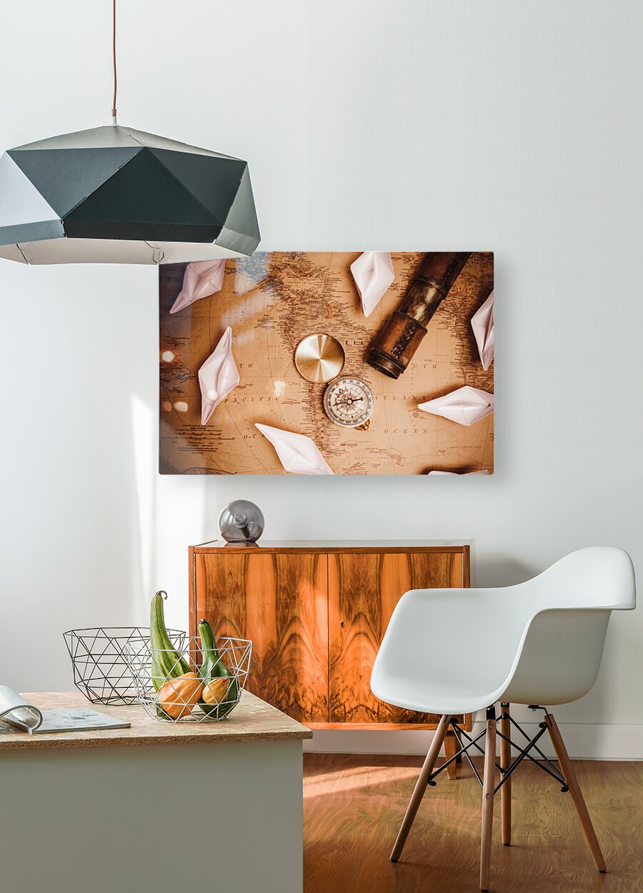 Get this artwork "Explorer desk with compass map and spyglass" in a framed print.