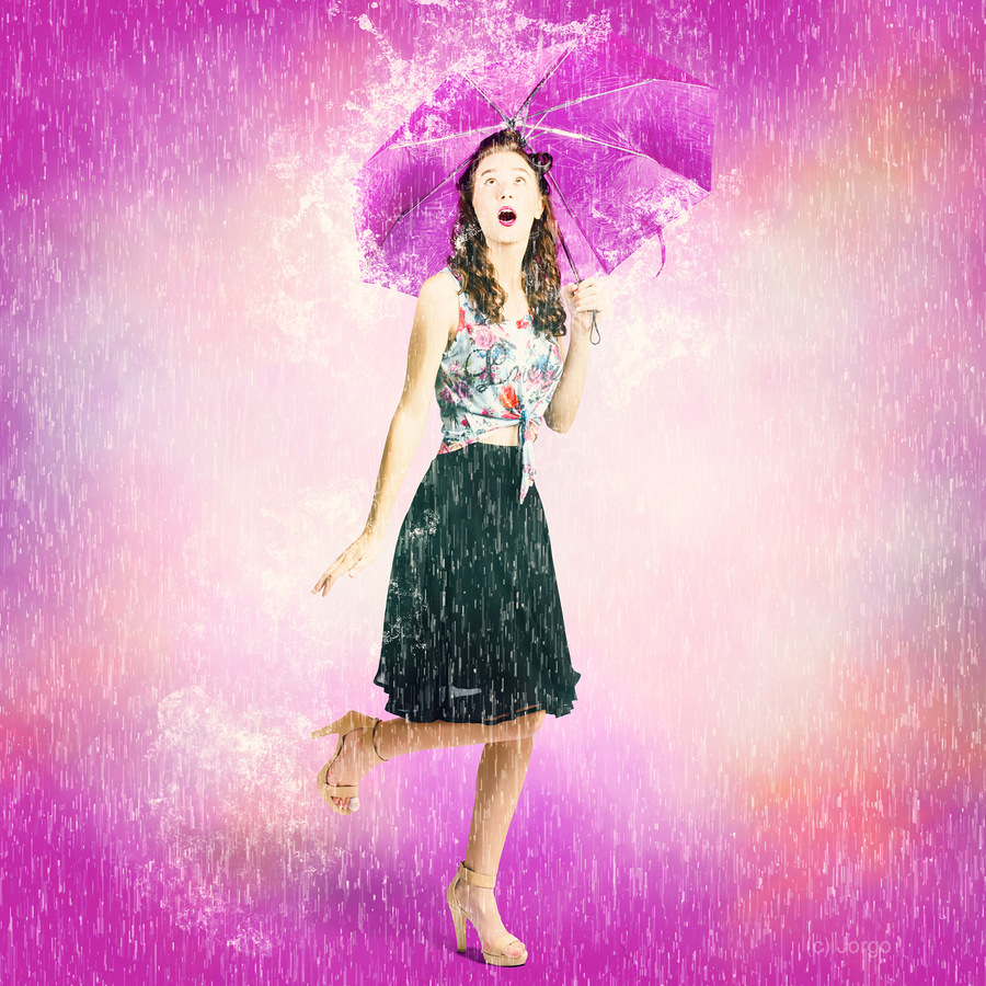 PIN-UP GIRL IN RAIN DOWNFALL. HOP SKIP AND JUMP
