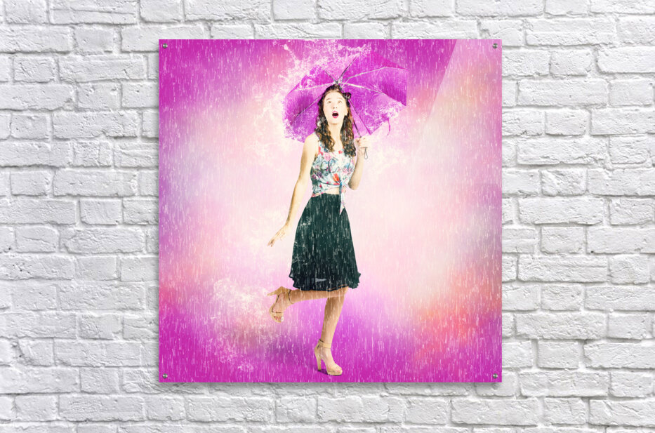 Pin-up girl in rain downfall. Hop skip and jump Picture Frame Printing