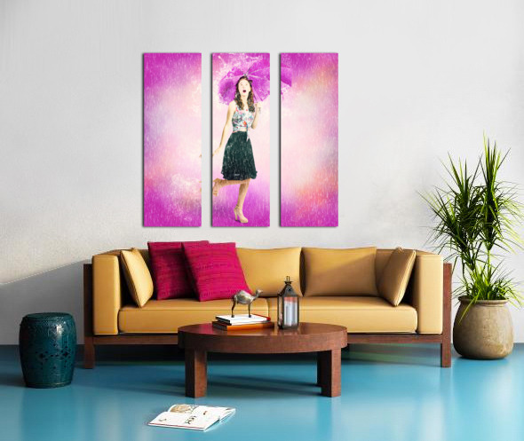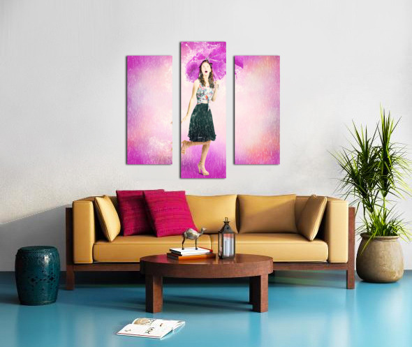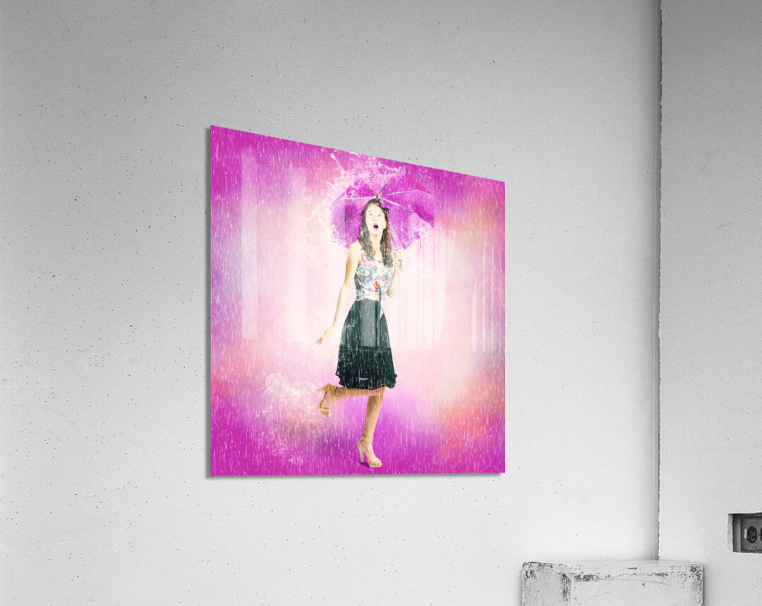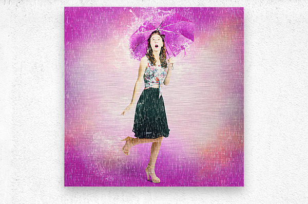 Get this artwork "Pin-up girl in rain downfall. Hop skip and jump" in a framed print.