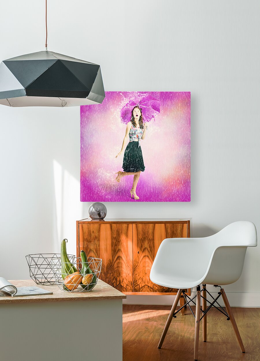 Pin-up girl in rain downfall. Hop skip and jump Wood print
