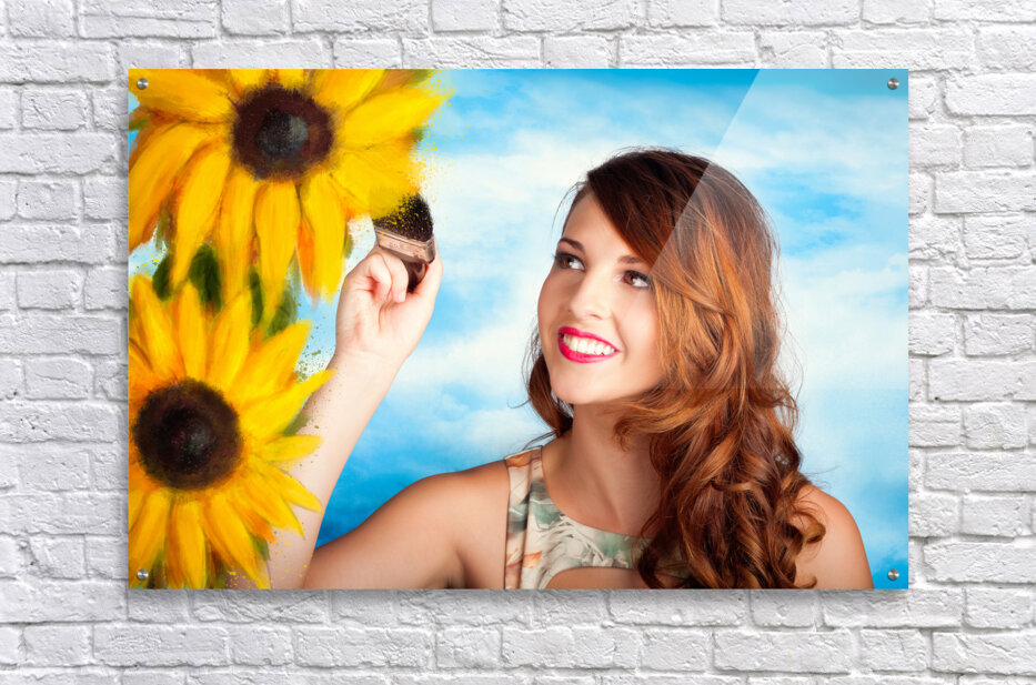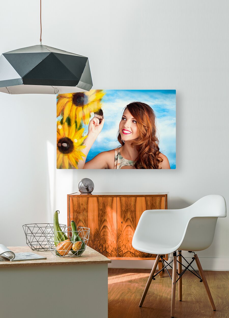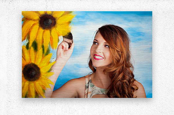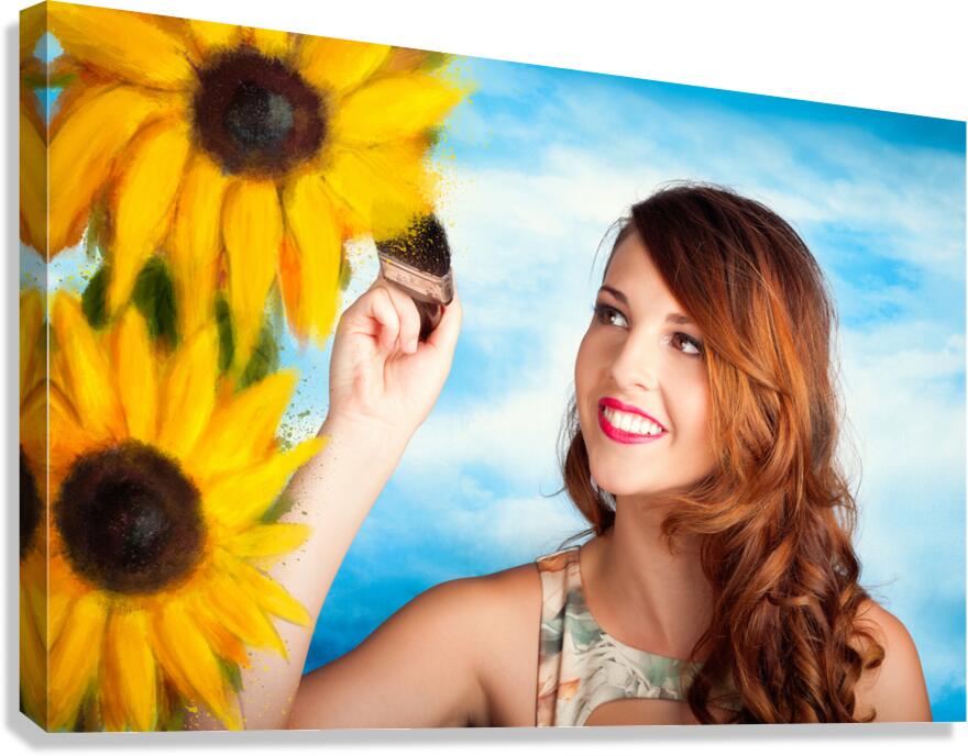 Illustration portrait of a creative woman painting sunflowers with a brush over sky background