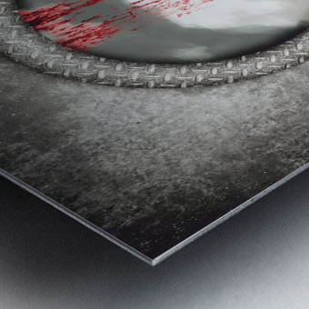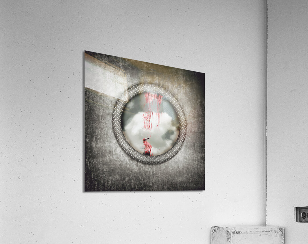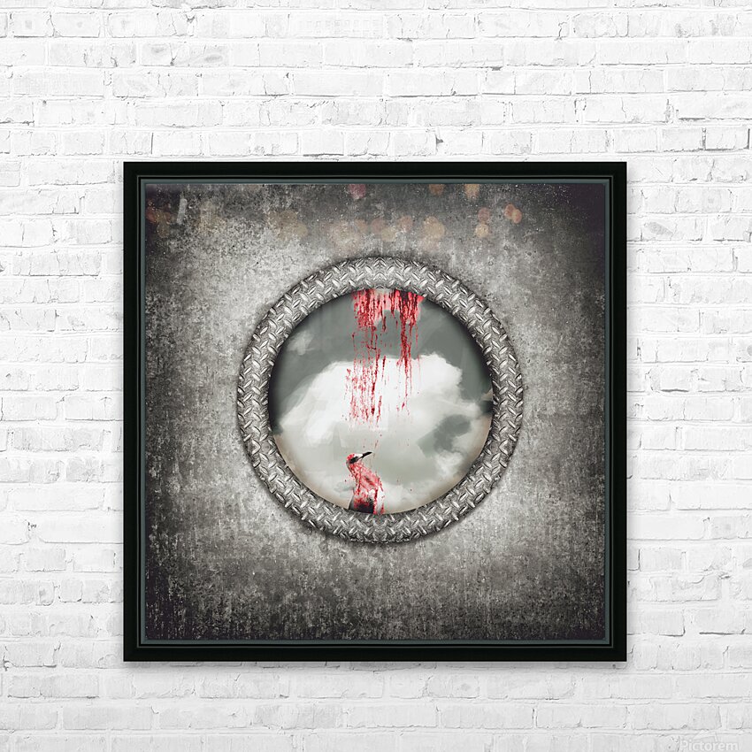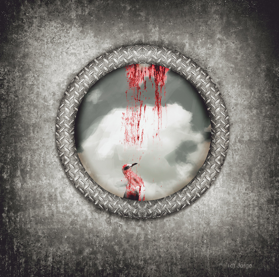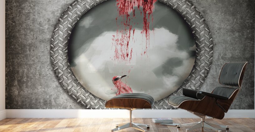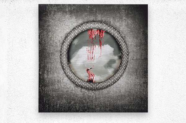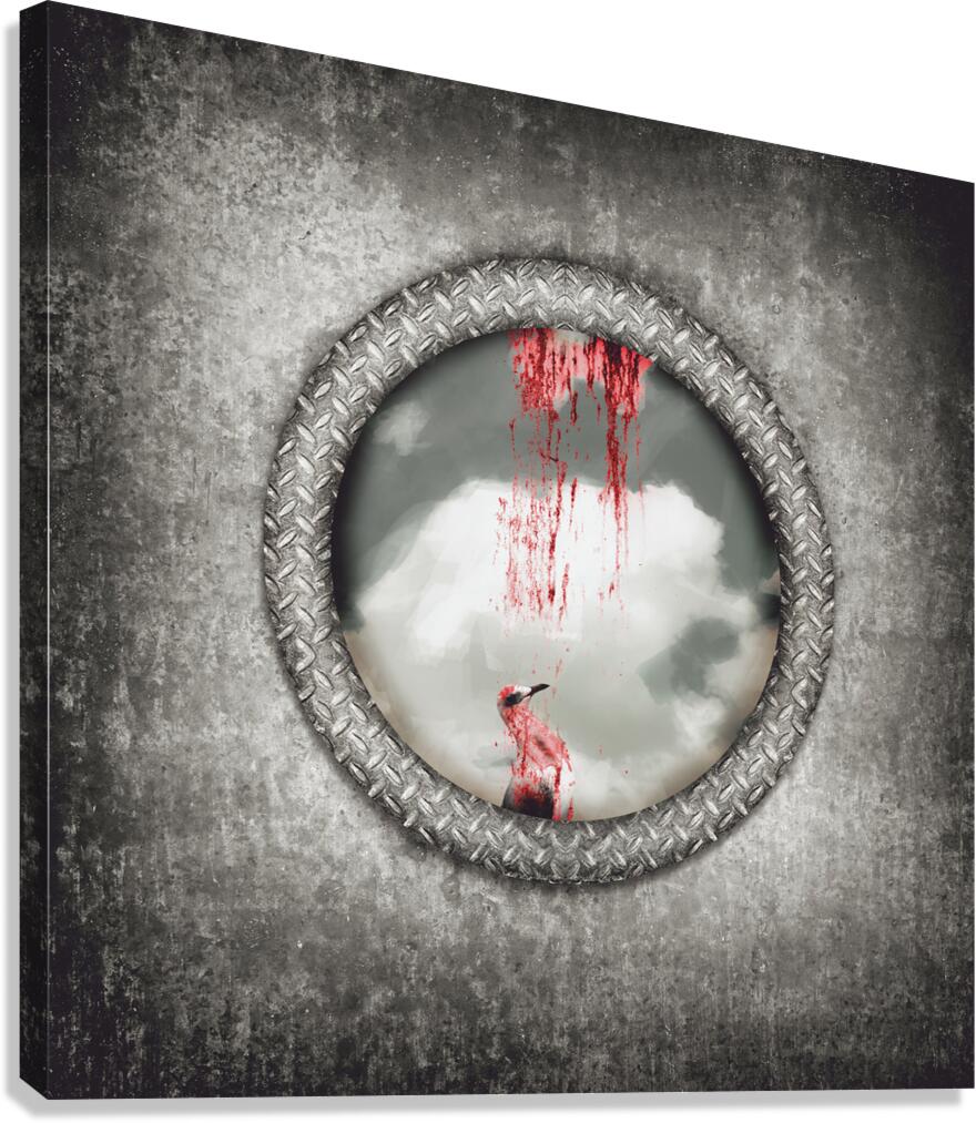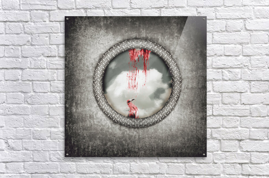Grunge image of a blind bird blood splattered against a navy porthole window in a depiction of having hit a wall