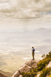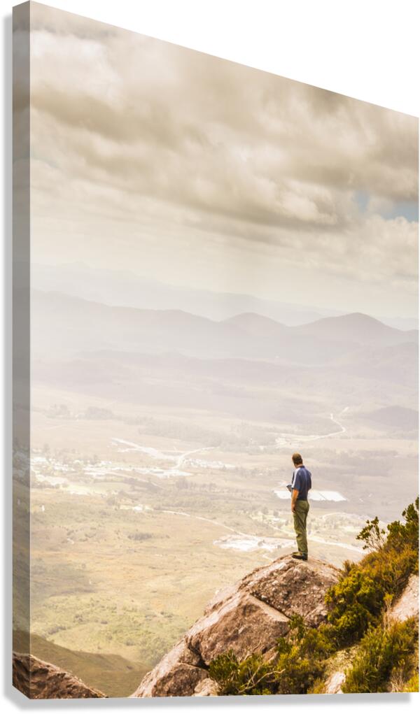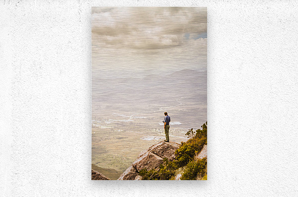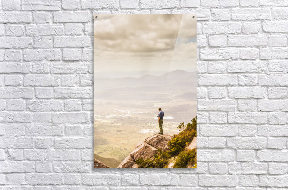 Elevated overview on a hiking man looking to the township of Zeehan from the pinnacle of Mt Zeehan Tasmania Australia