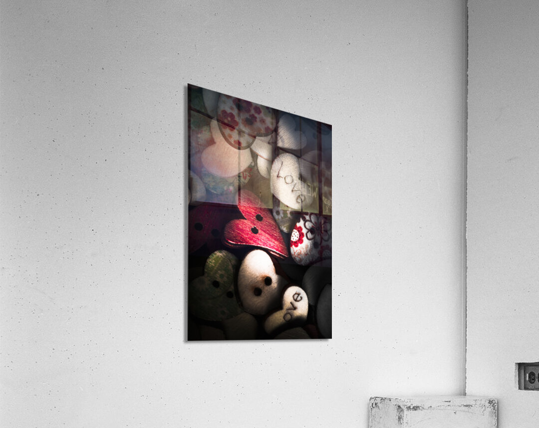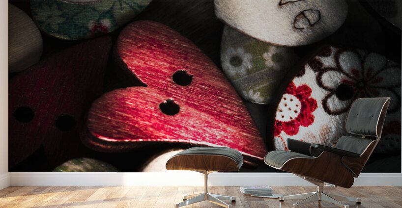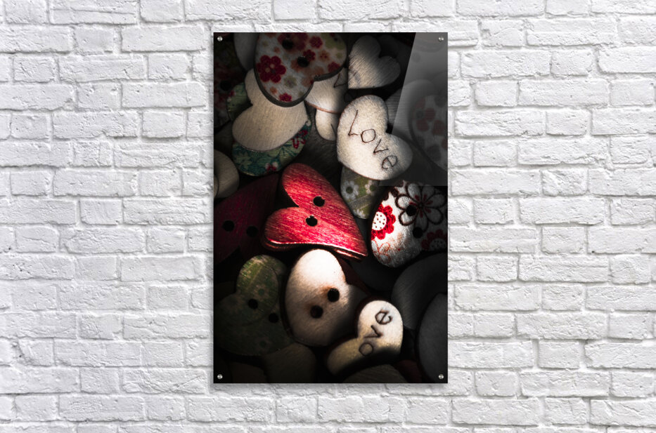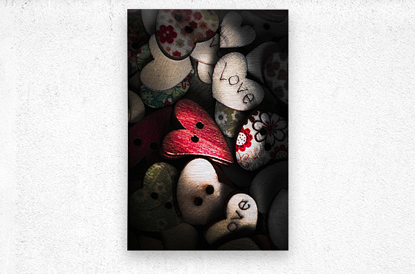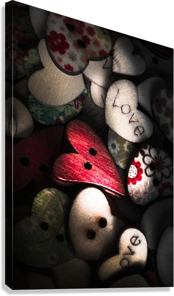 Dark shadowed still-life photo of light illuminating a red love heart button with sentiment in the sewing box