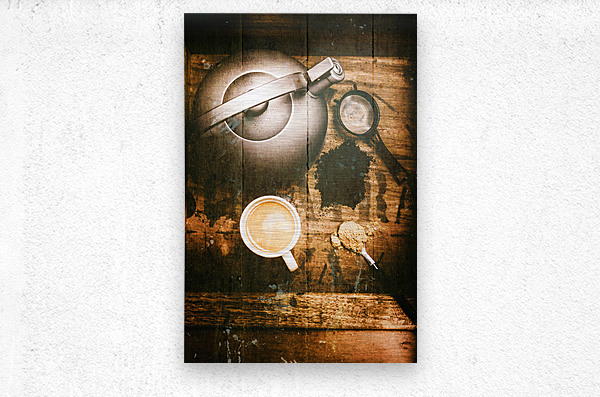Vintage cafe art on a tea crate background with black tea powder tea strainer tea pot teacup and a spoonful of brown sugar on a old wood panel backgro...[+]