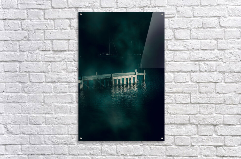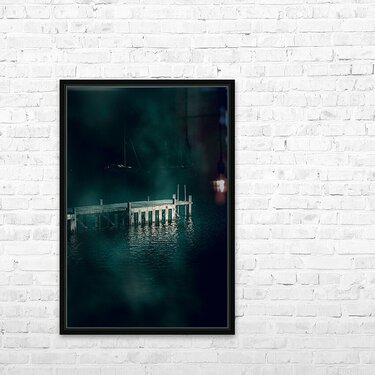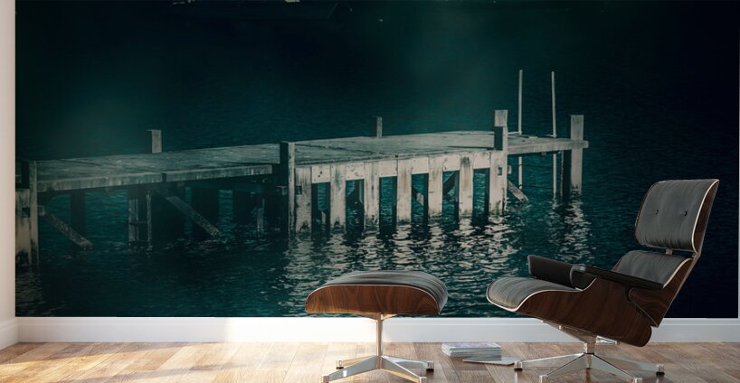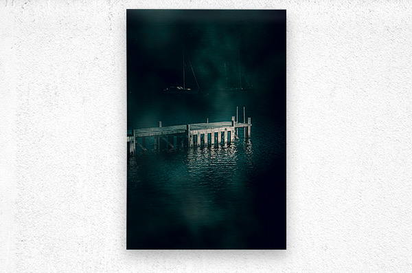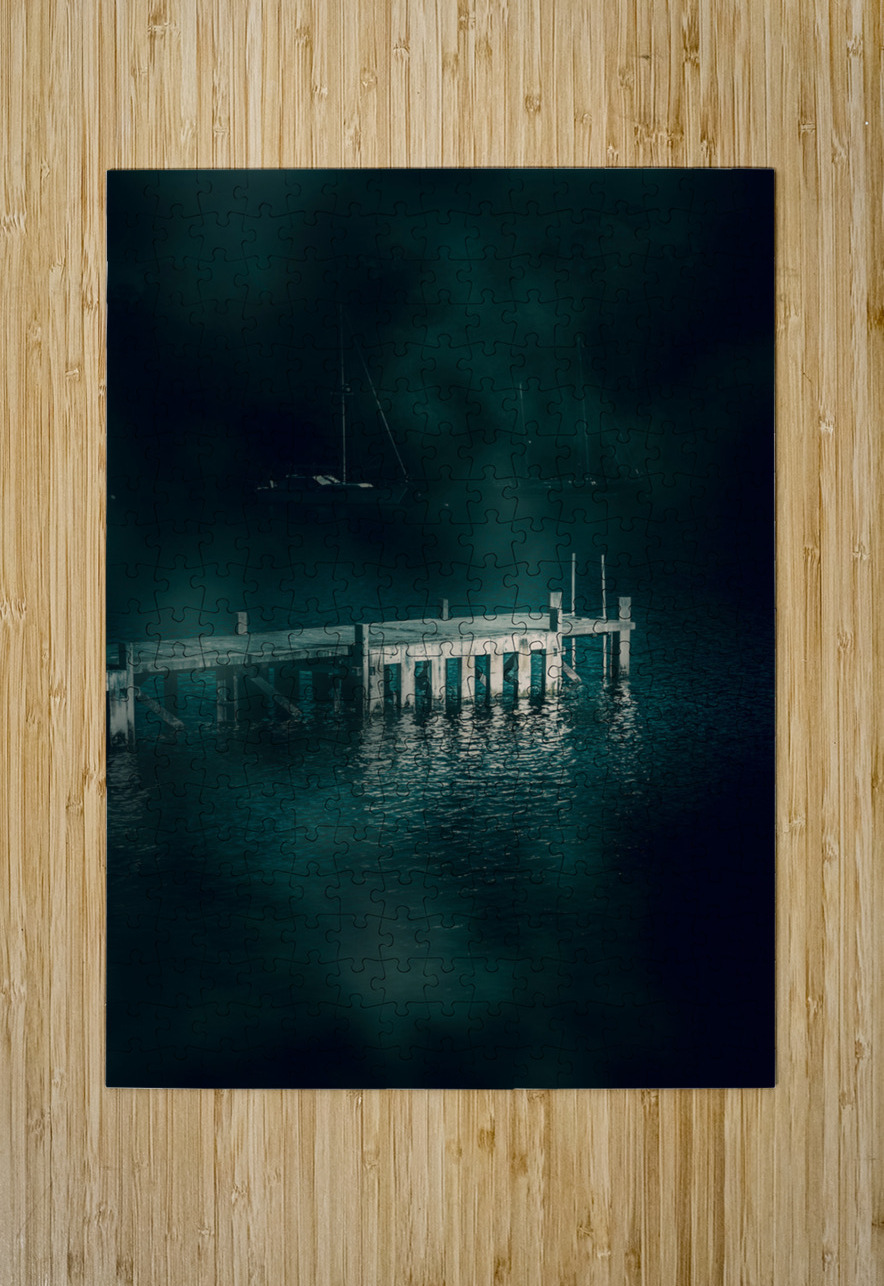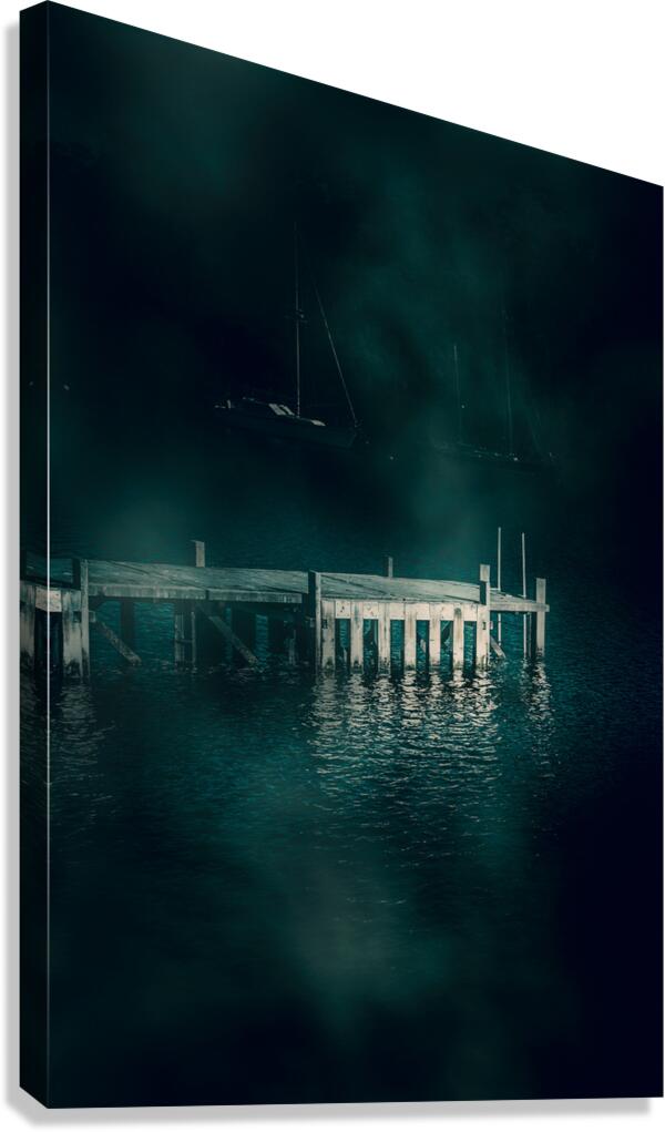 Vertical night landscape on the end of a chilling wood mooring surrounded by a haze of misty darkness. Barnes Bay Bruny Island Tasmania Australia