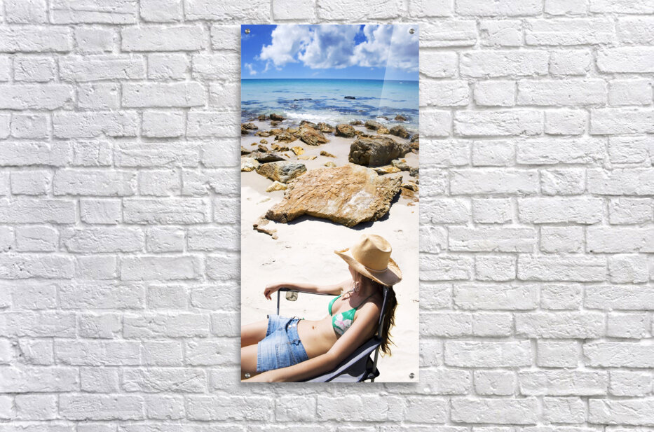 Beach Woman Relaxing By A Beautiful Rocky Island Coastline