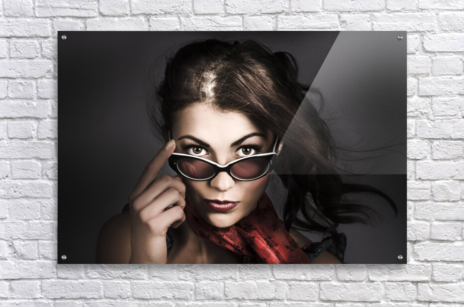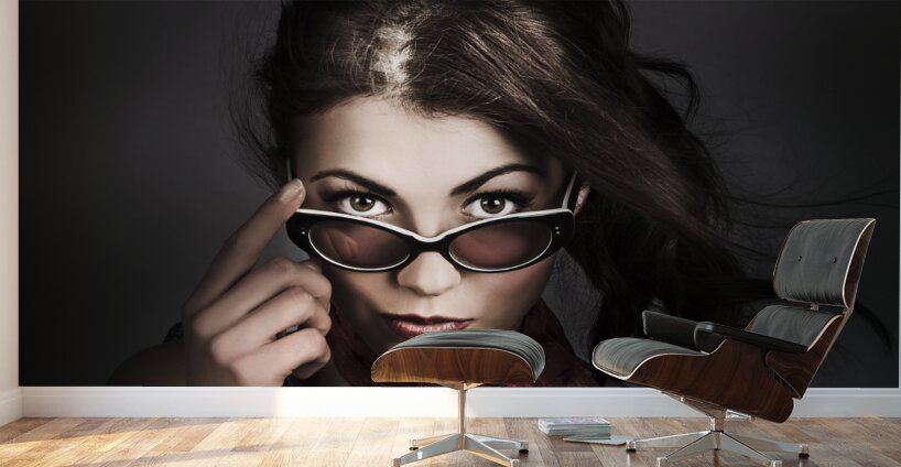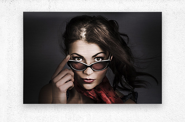 Dark fashion portrait of a beautiful and mysterious young woman with windblown brunette hair and 50s makeup wearing pinup sunglasses