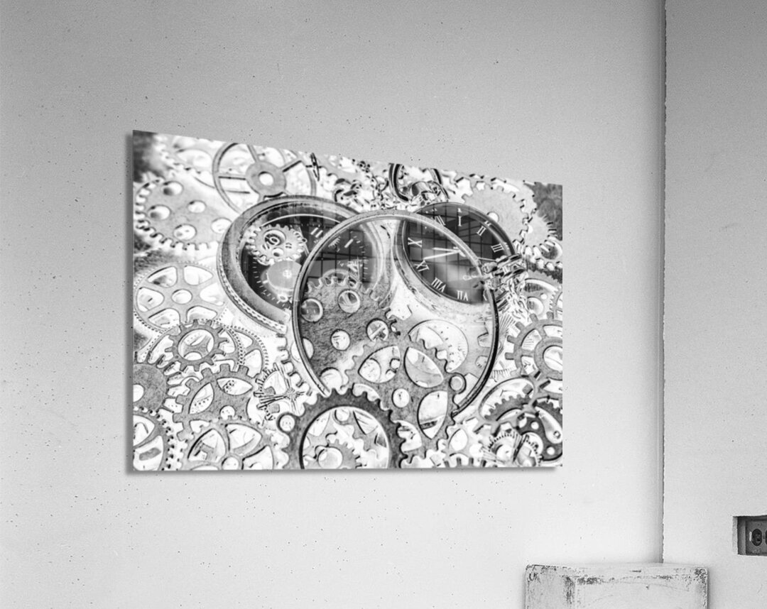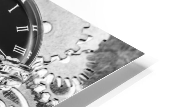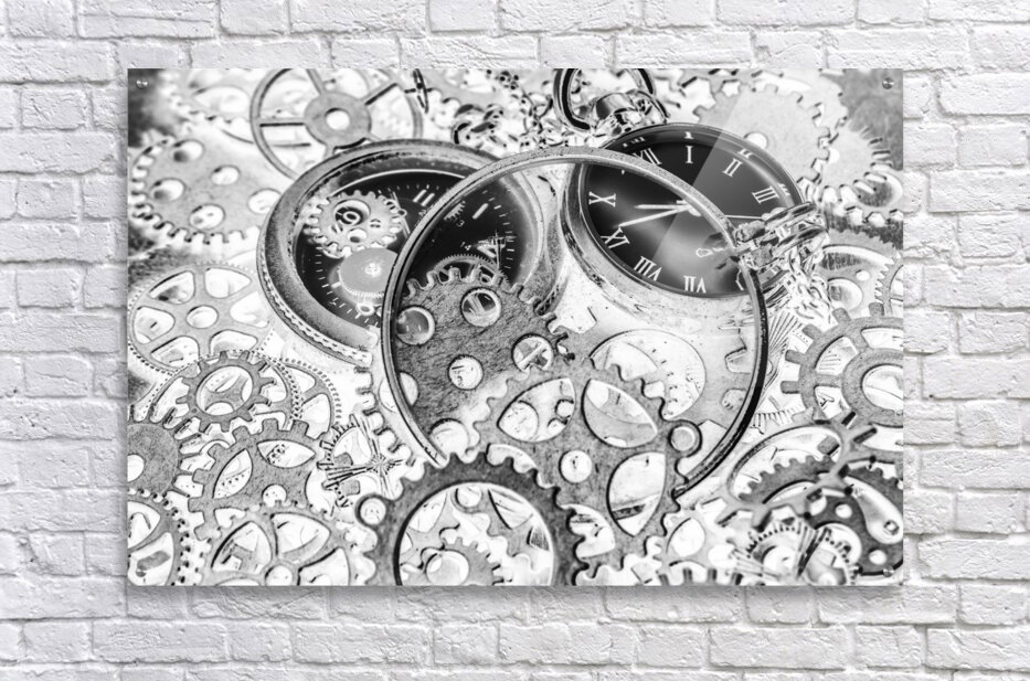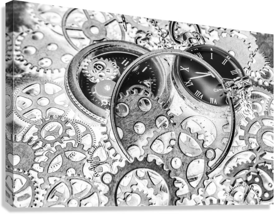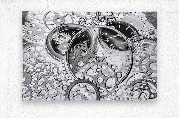 Antique metal artwork on mechanised time stopped in an open case of technical repair. Wayback watch workshop