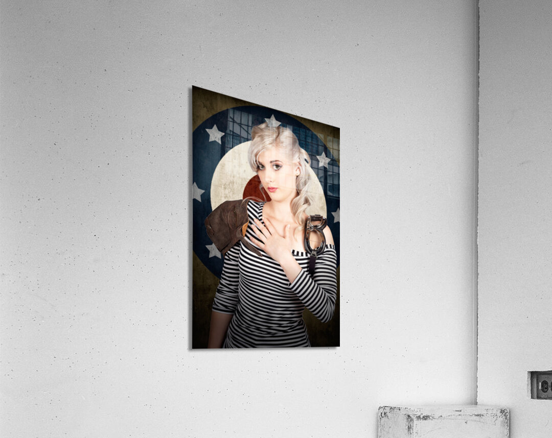 Portrait of young blonde pin up woman taking airplane pilot oath. Military honour and loyalty