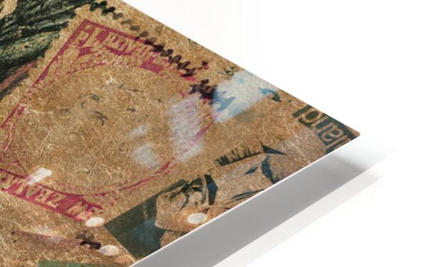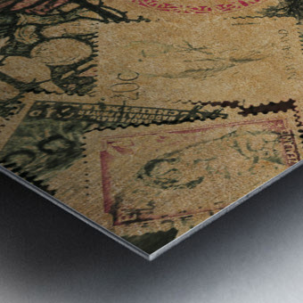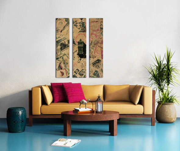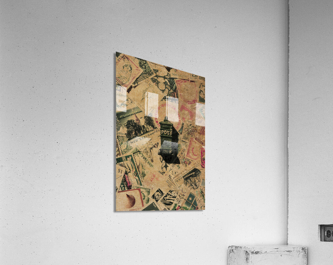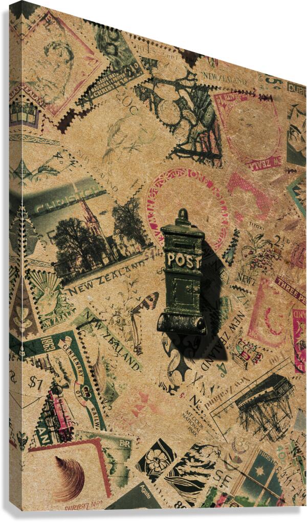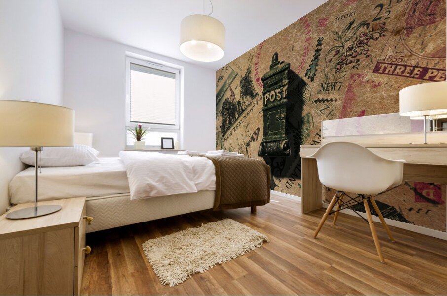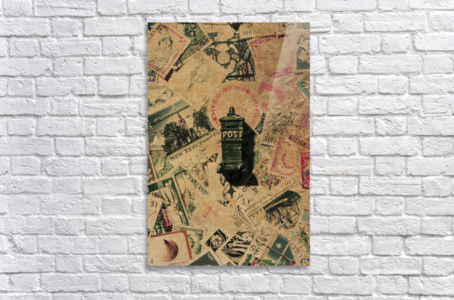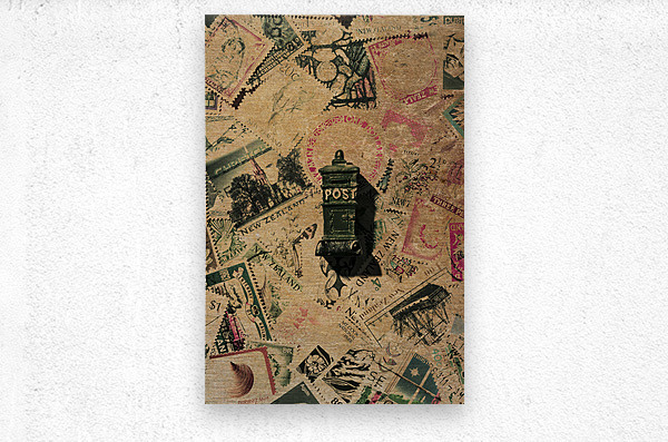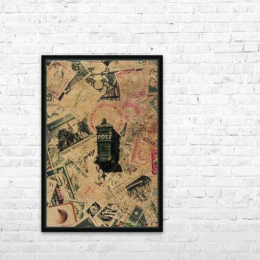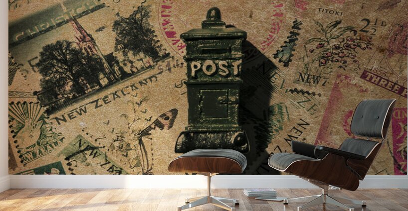 Vintage wall art scene on a green postbox overlaid on a mixture of historic stamps from past letters sent