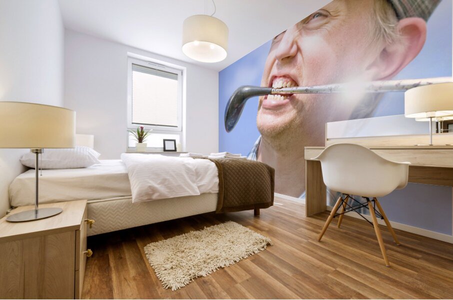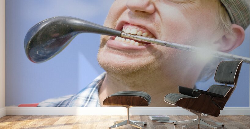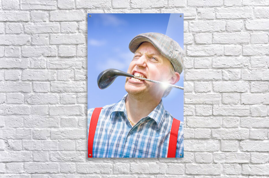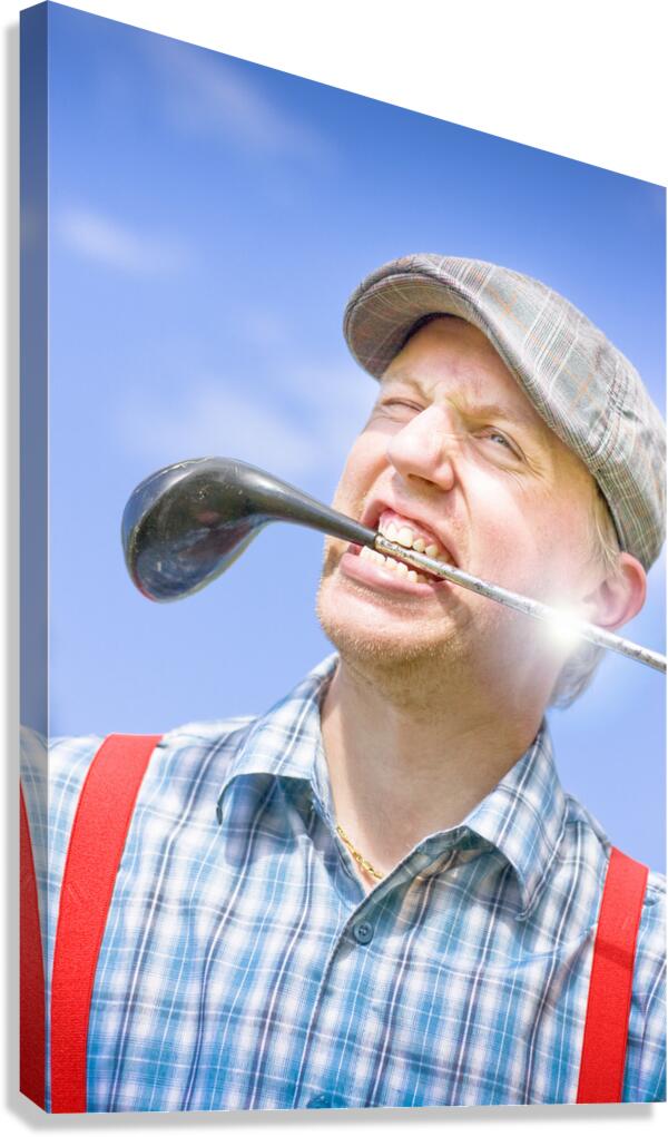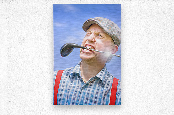Mad cap golfing portrait on a wacky player whacking out a clubhouse smile with driver style