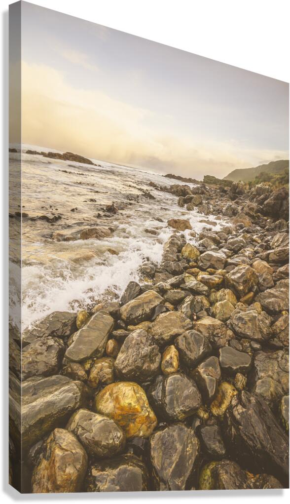 Harmonious retro filter background of a rocky seashore scene with rounded stones and dawn colours. Trial harbour Tasmania Australia