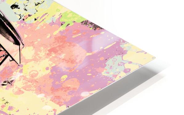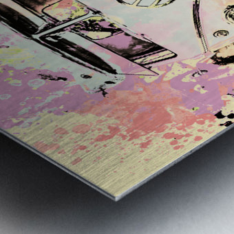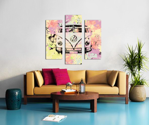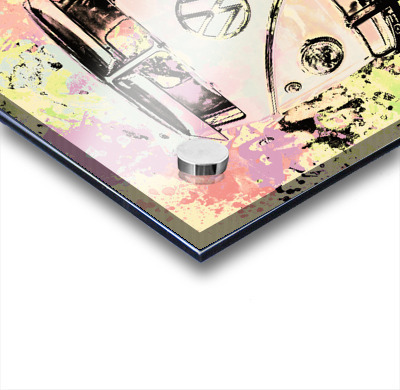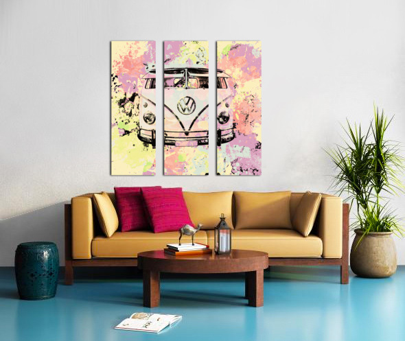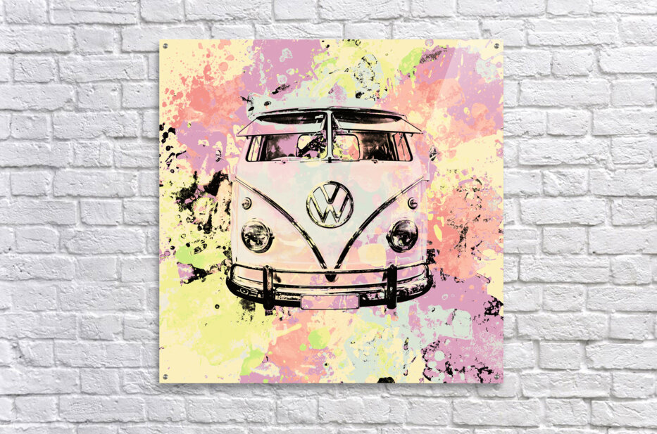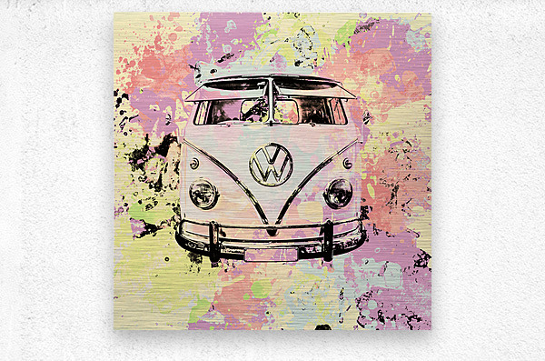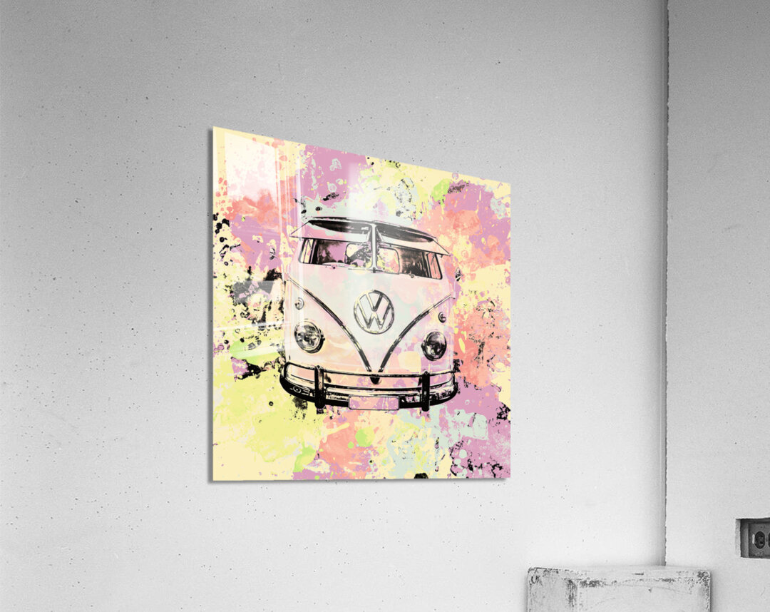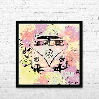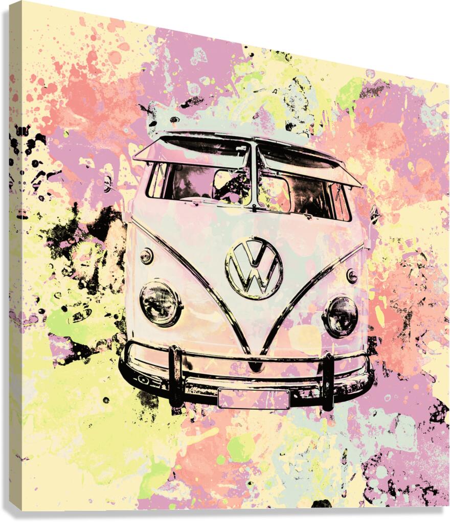 Pastel coloured art on a seventies holiday in funky nostalgia with VW summer van in splashed out abstract. Hippie trip