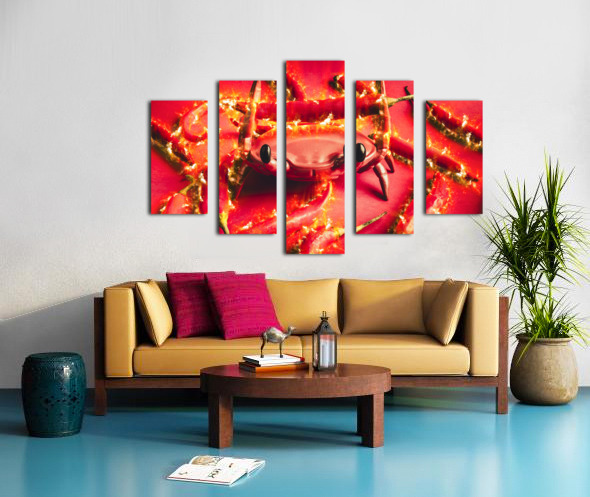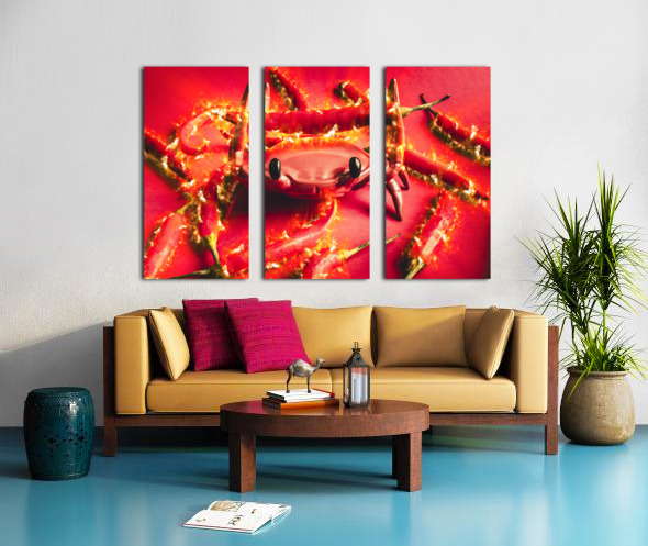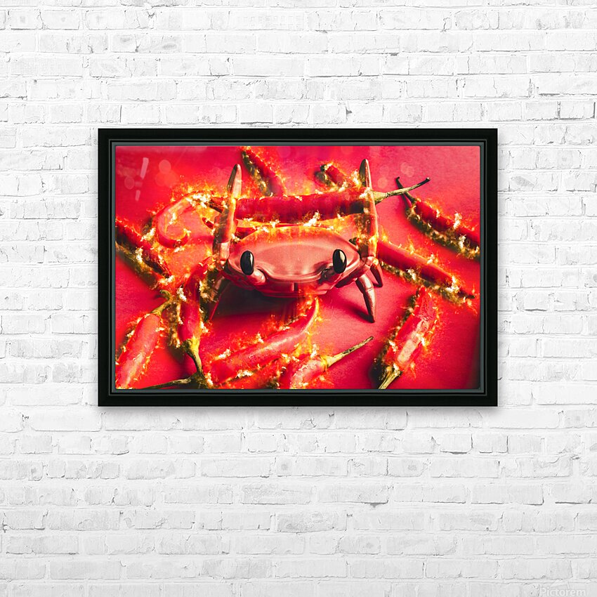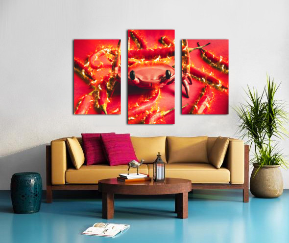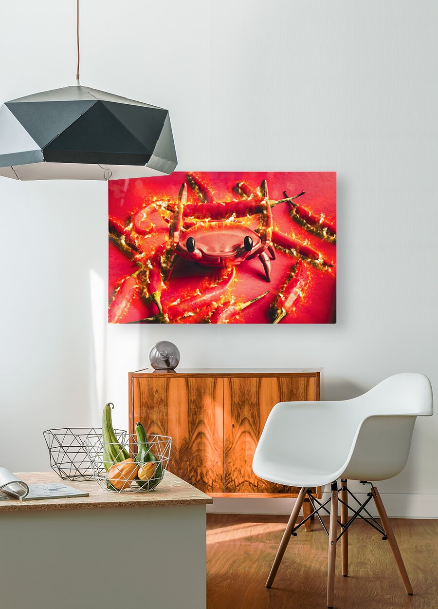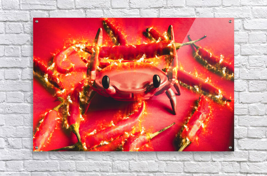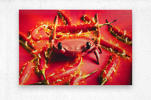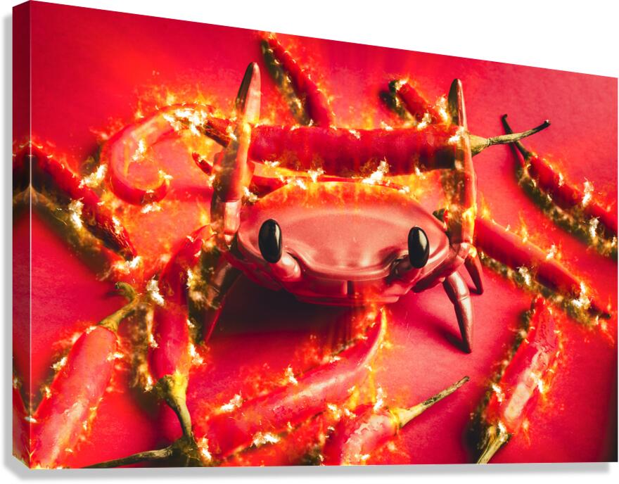 Hot crab art on a catch of spicy red chilli peppers with flames of scorched delight