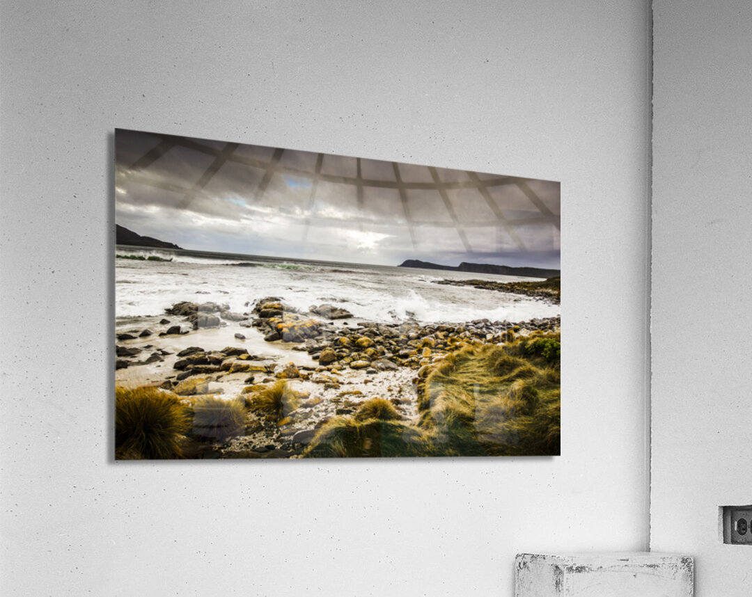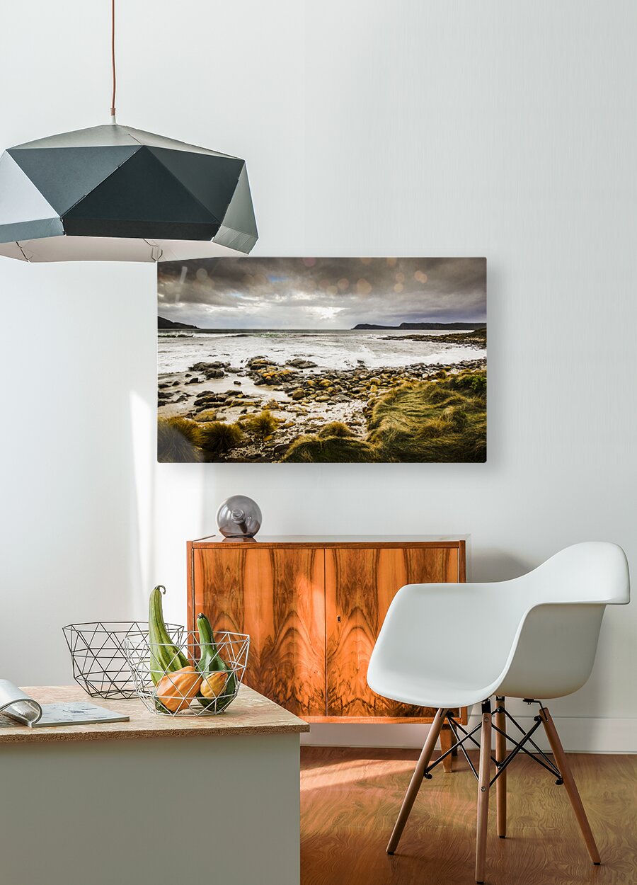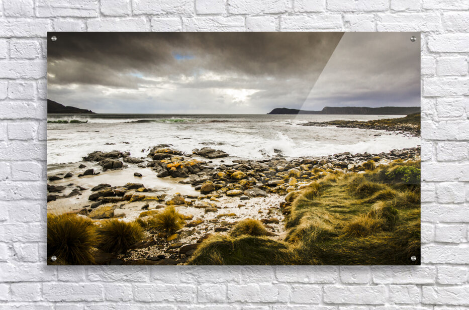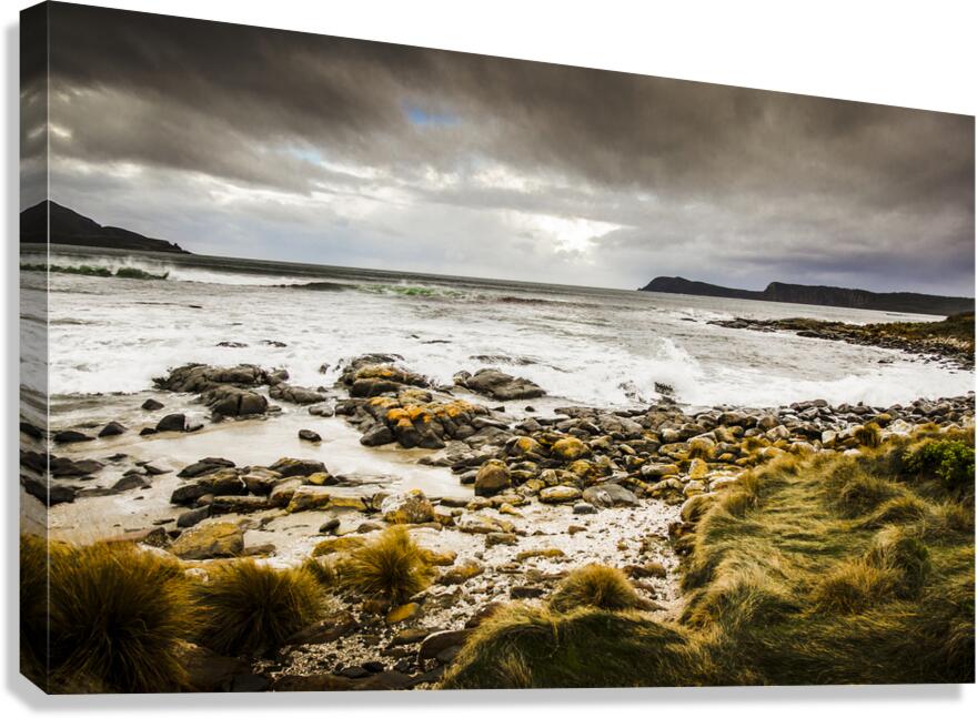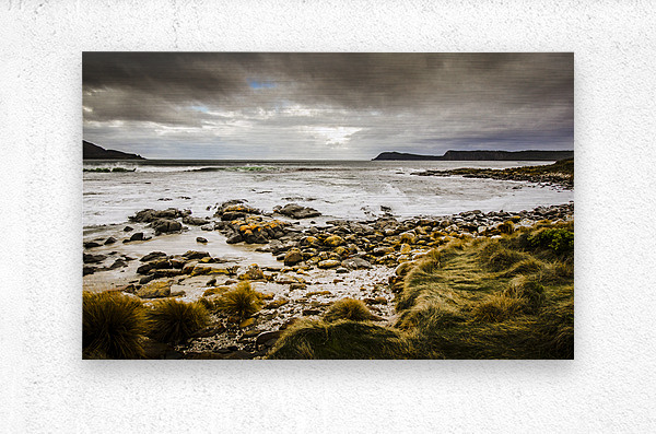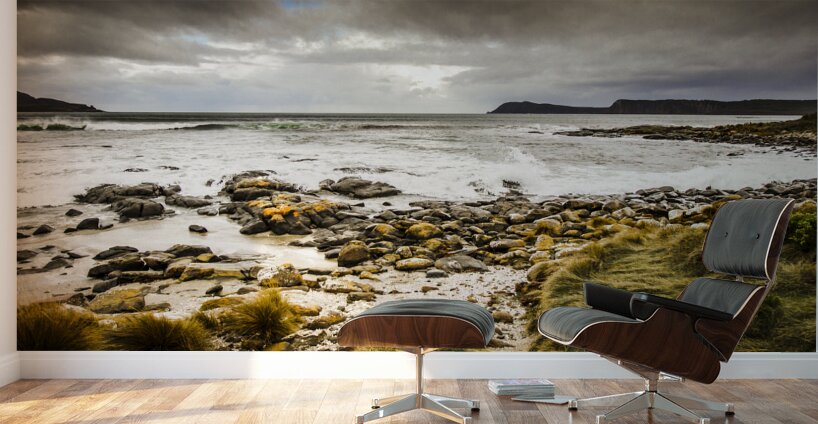 Intense wide-angle landscape picture on the stoney coastal shores of Bruny Island Tasmania. Storm clouds over Cloudy Bay