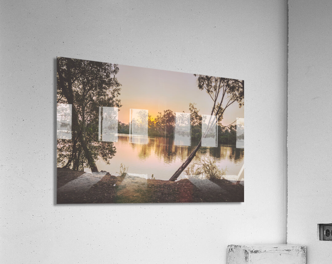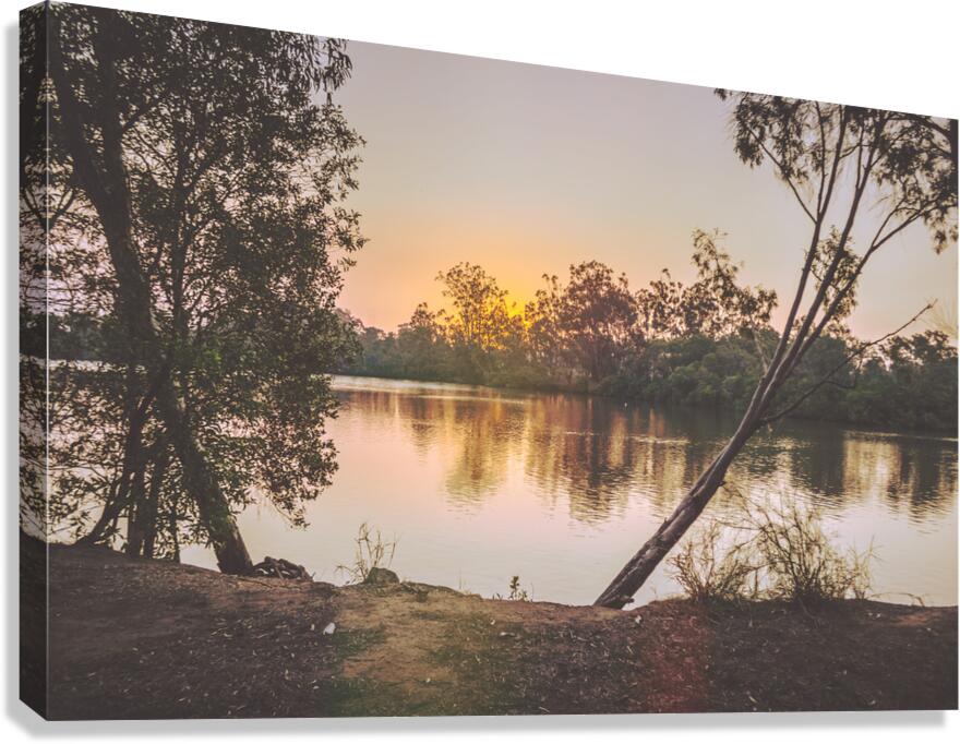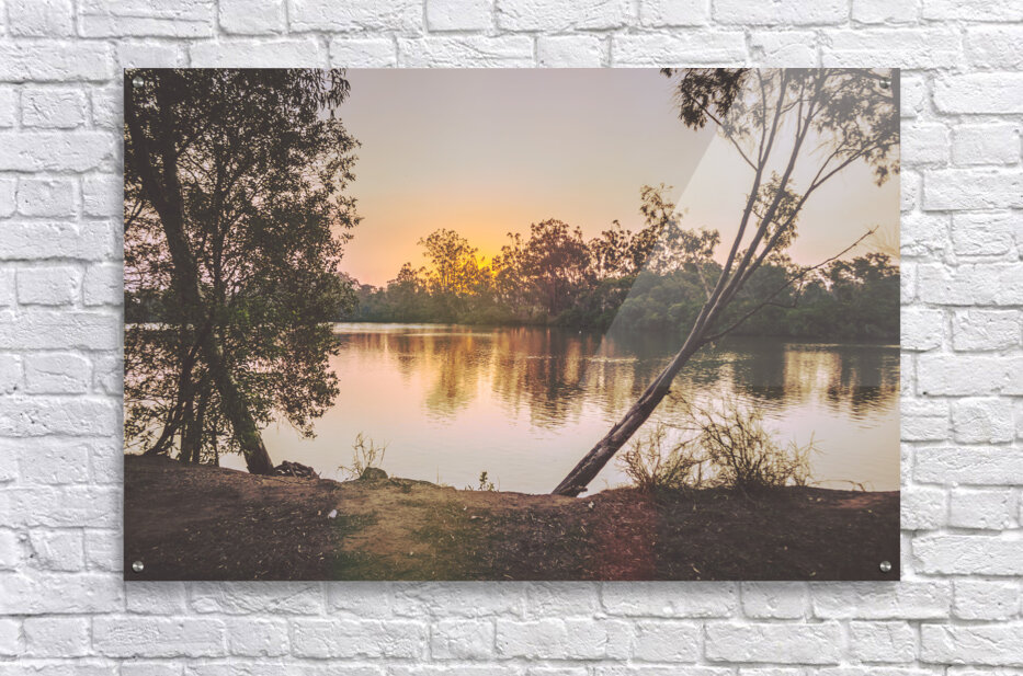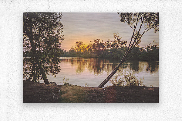 Peaceful country scene of a glowing setting sun against harmonious bushland dynamics. Late light