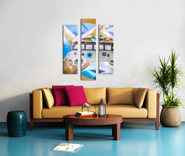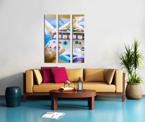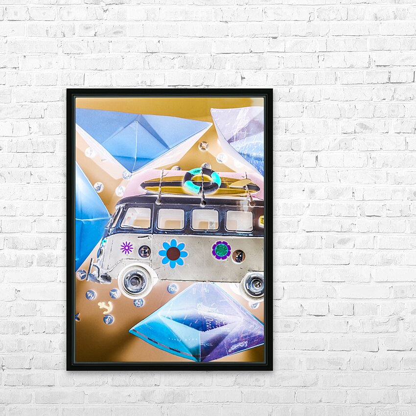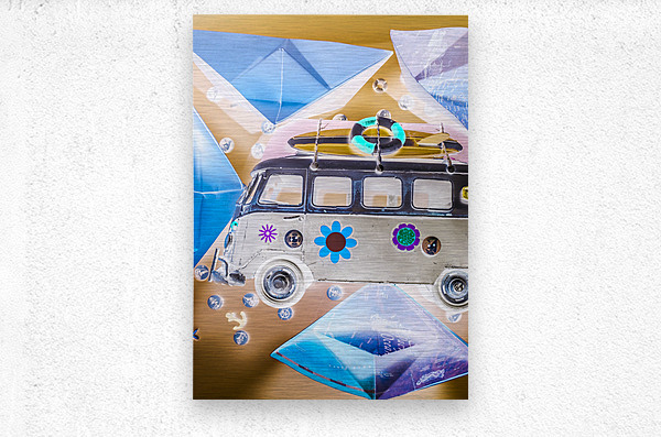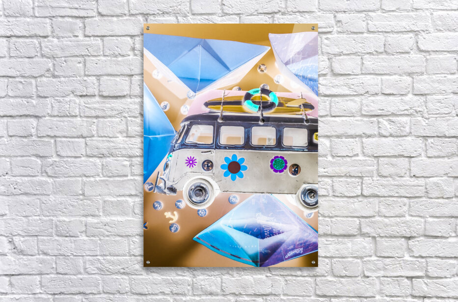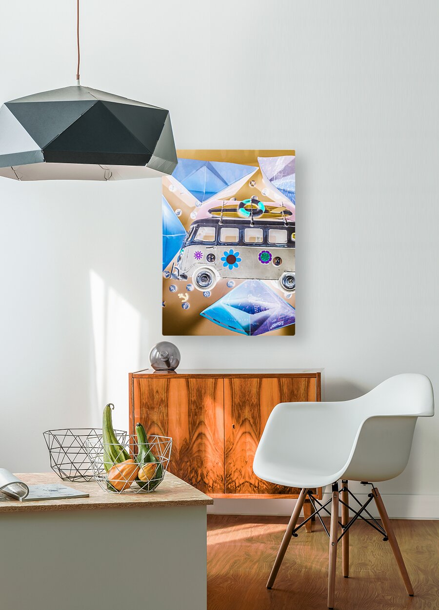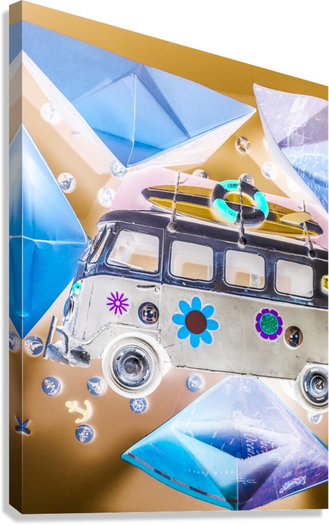Pop art poster design on a classic campervan on a ocean expedition in abstract sail. The Beachery