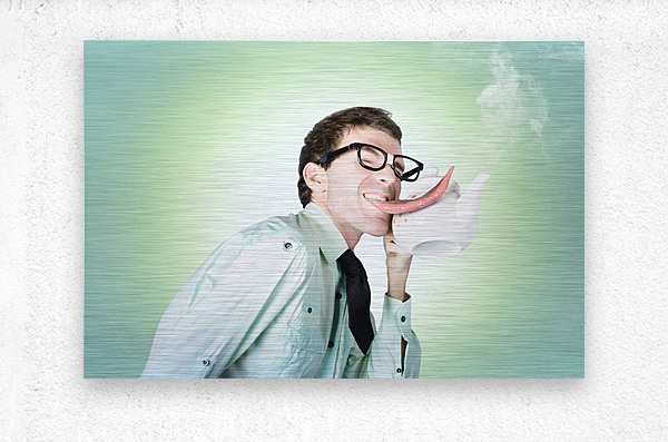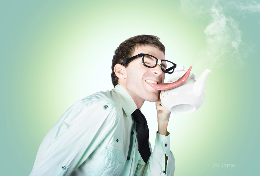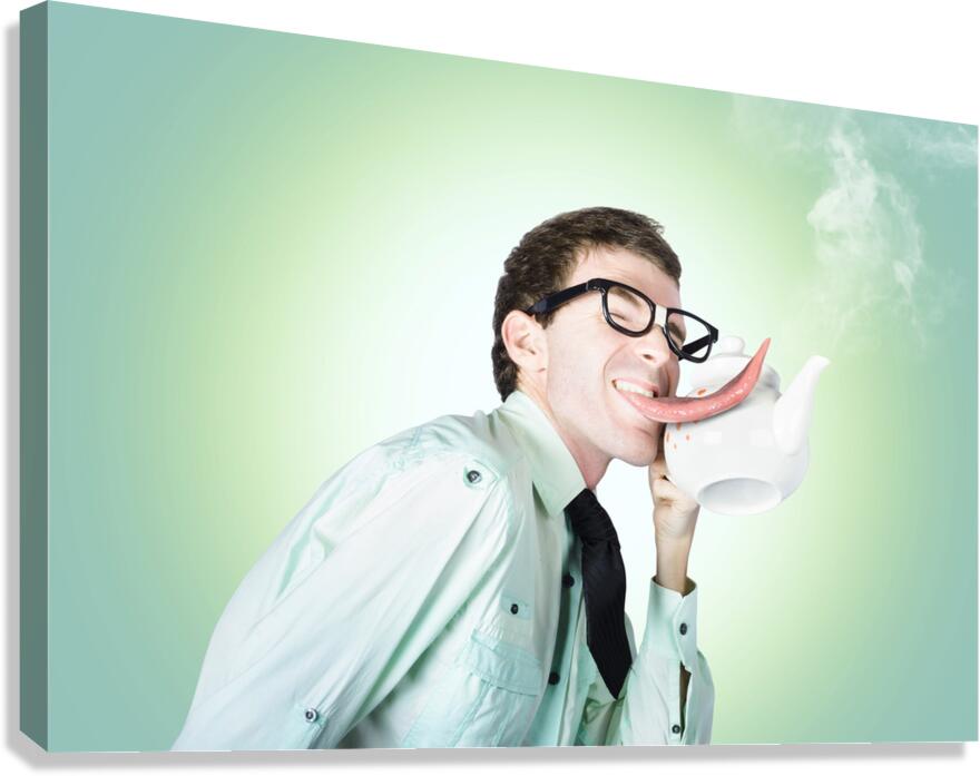 Sensual dorky man getting ready for some coffee love when licking a steaming hot kettle with his well-endowed tongue