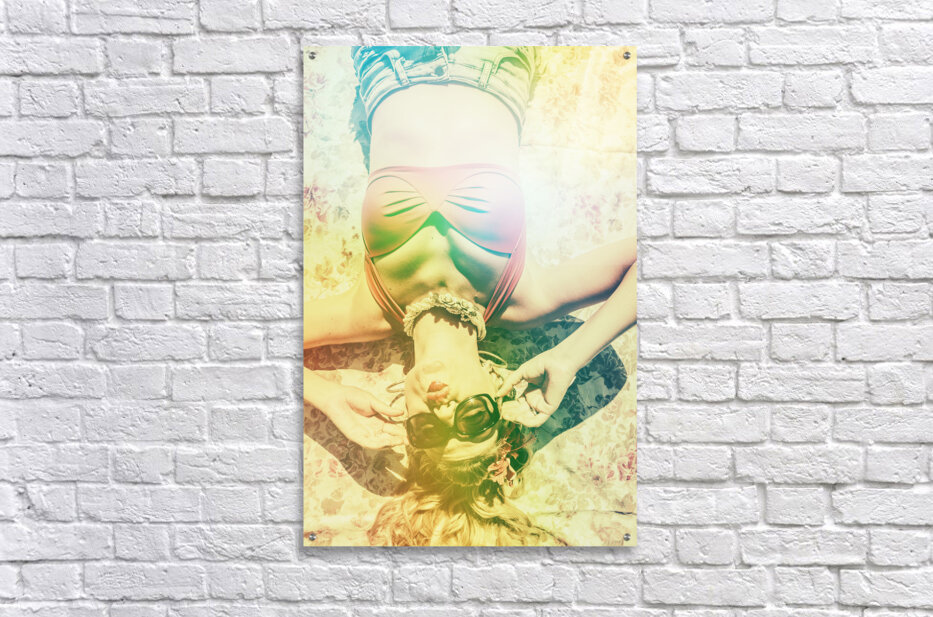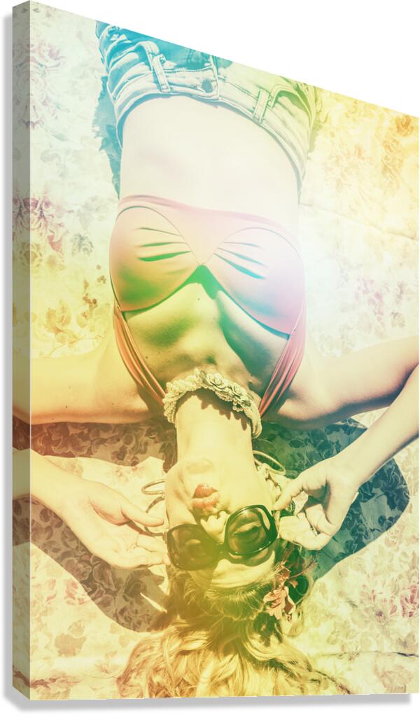 Upside down view from above on pinup woman in bikini top laying down on ground with puckered lips. Retro pool party babe