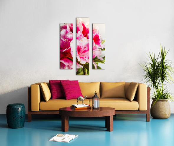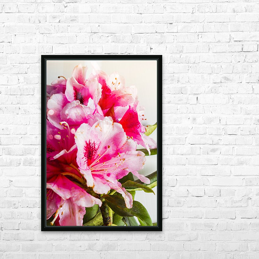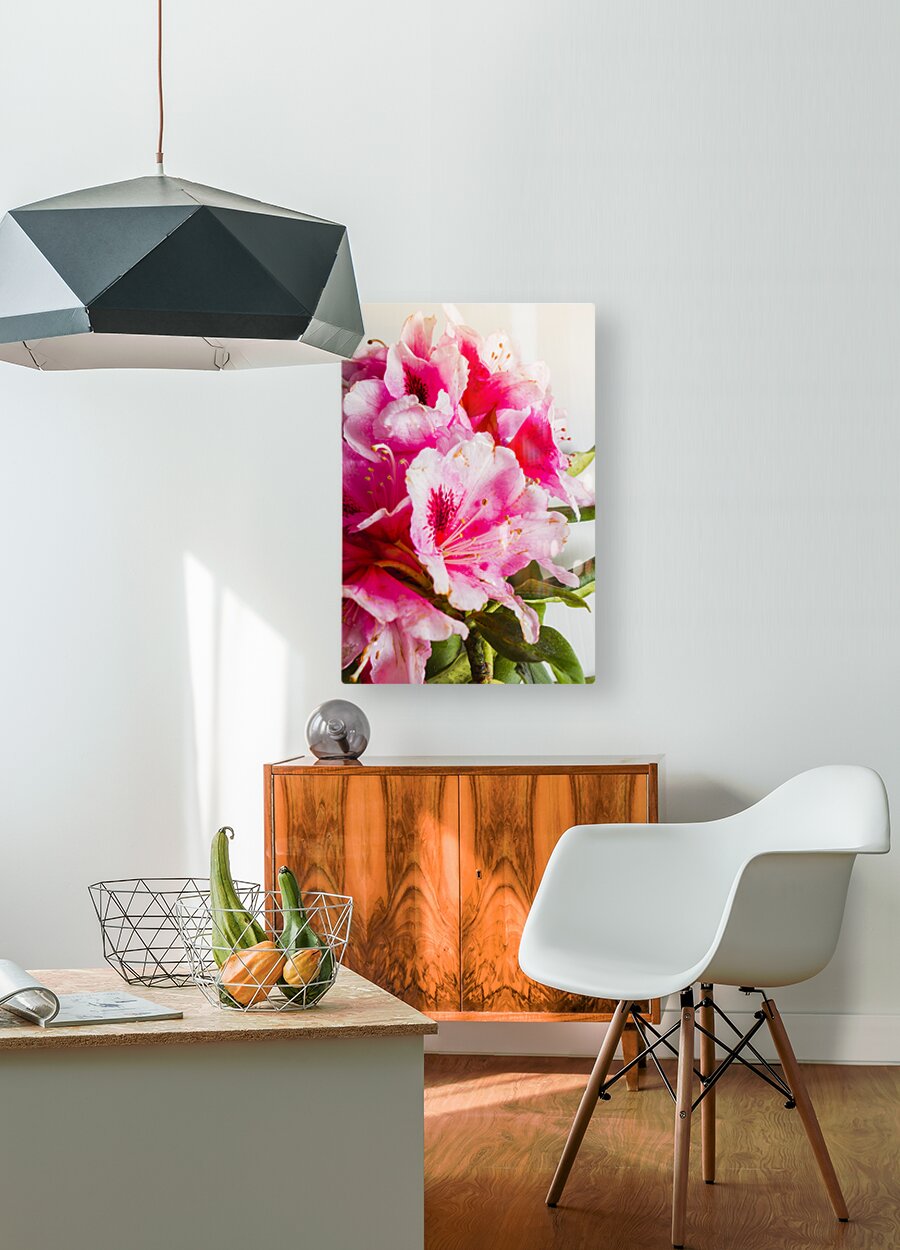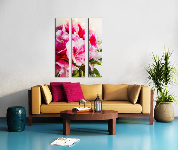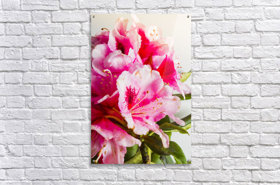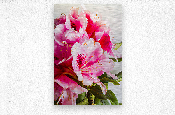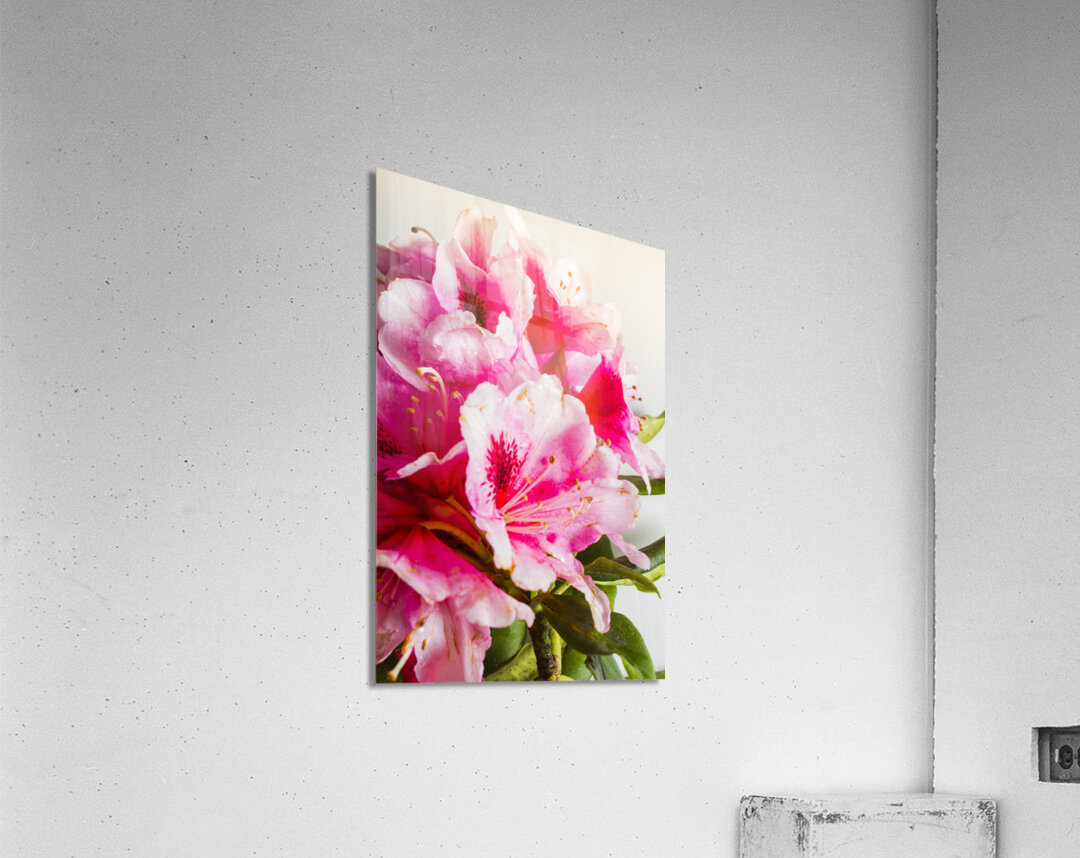 Pink nature art on a closeup floral bunch of Rhododendron flowers captured indoors on grey background. Spring of flower bouquets