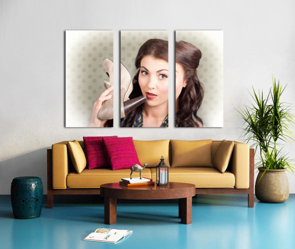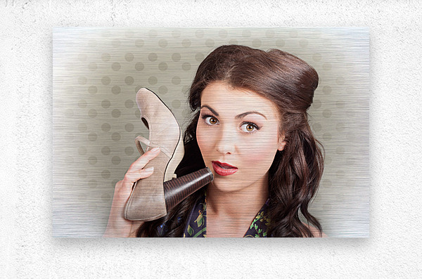 Funny fashion portrait of a glamour pin-up woman with surprise look talking on retro high heel shoe phone. Hi fashion... hello fashion