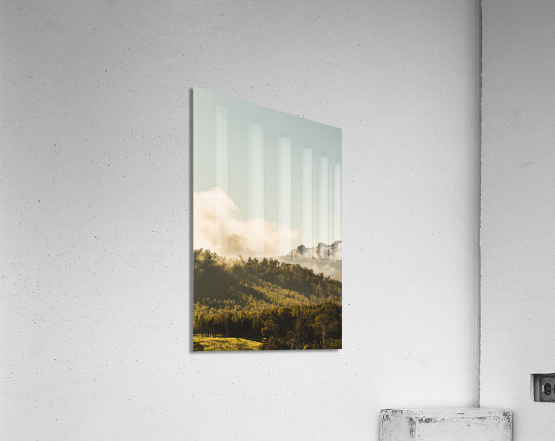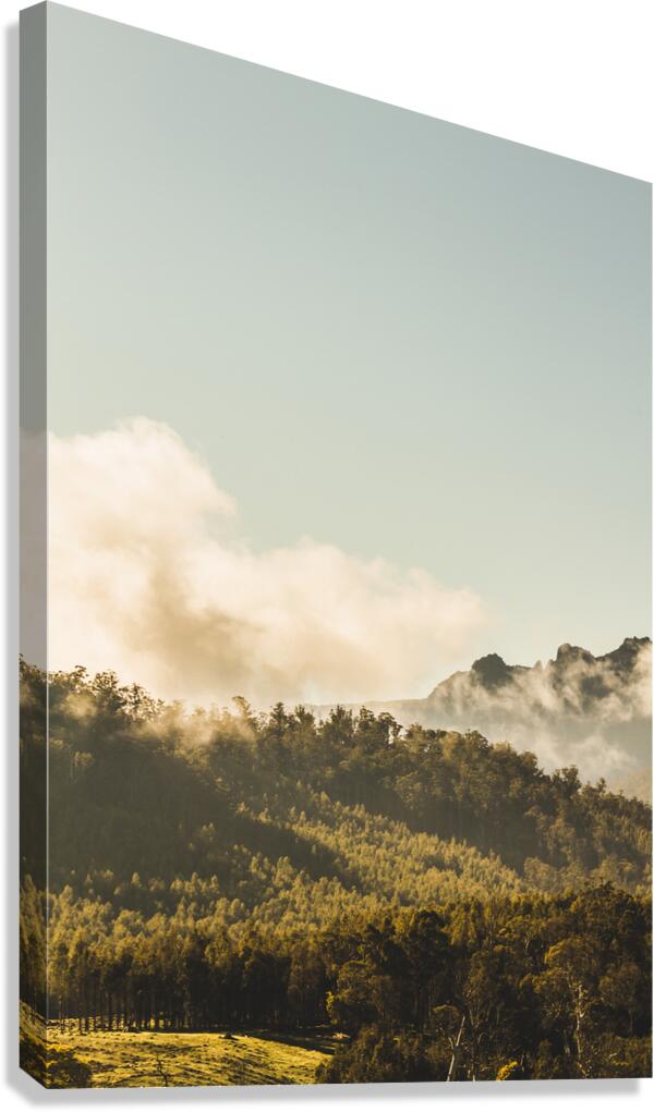 Old-fashioned landscape on a foggy dawn view on woodlands before rocky mountain peaks. Blessington Tasmania Australia