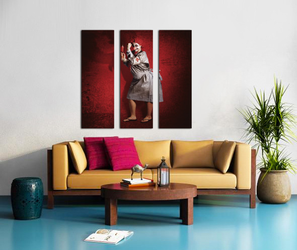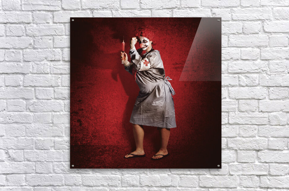 Get this artwork "Scary clown doctor about to give jab with syringe" in a framed print.