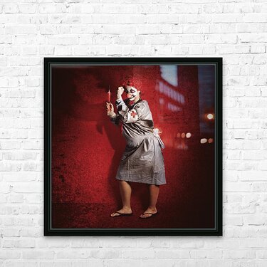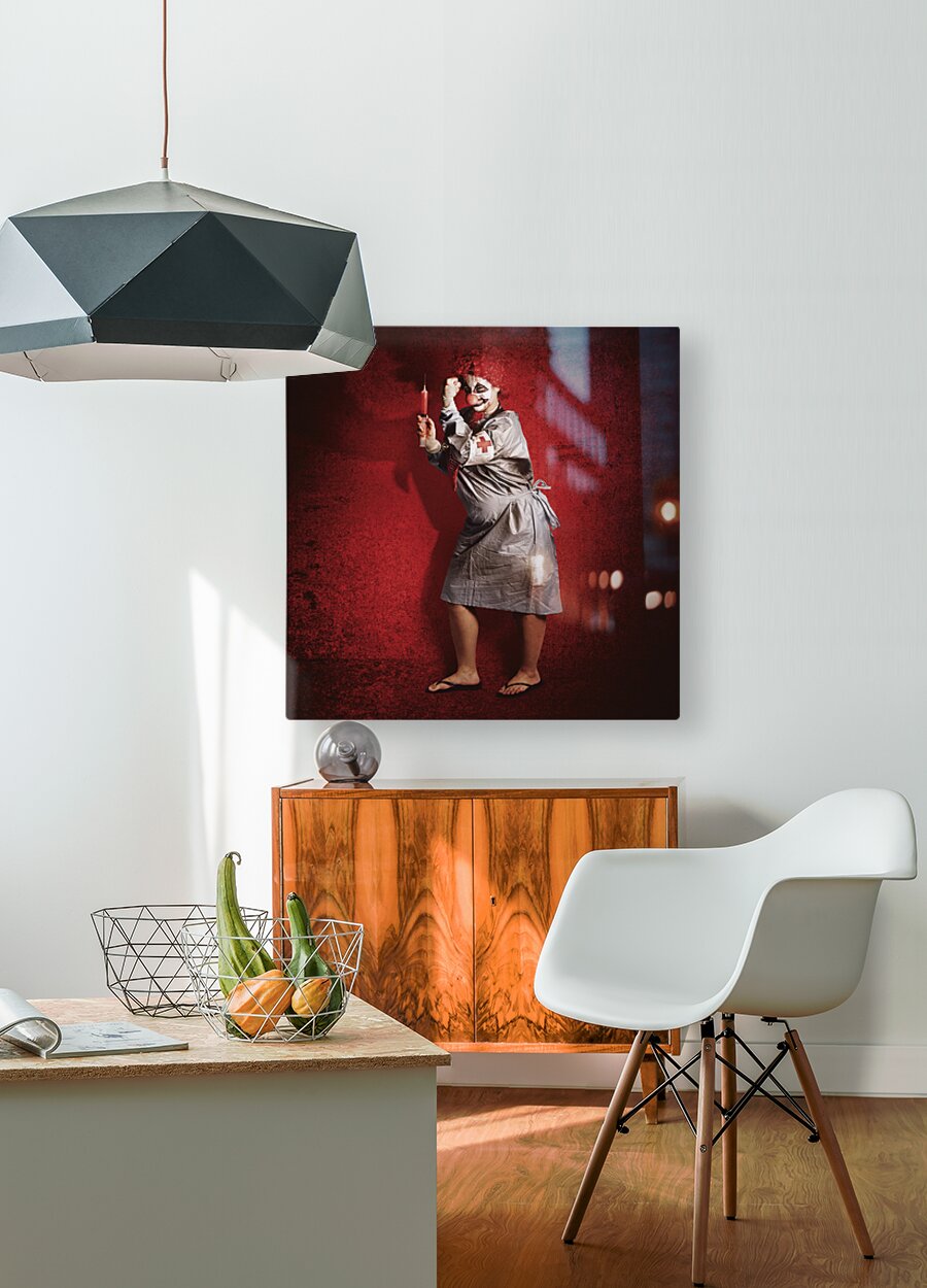 ABOUT THIS ARTWORK: SCARY CLOWN DOCTOR ABOUT TO GIVE JAB WITH SYRINGE