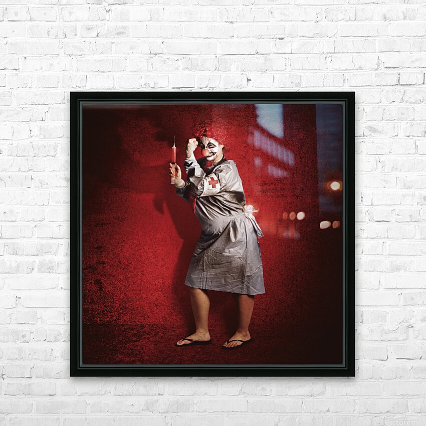 Scary clown doctor about to give jab with syringe Picture Frame Printing