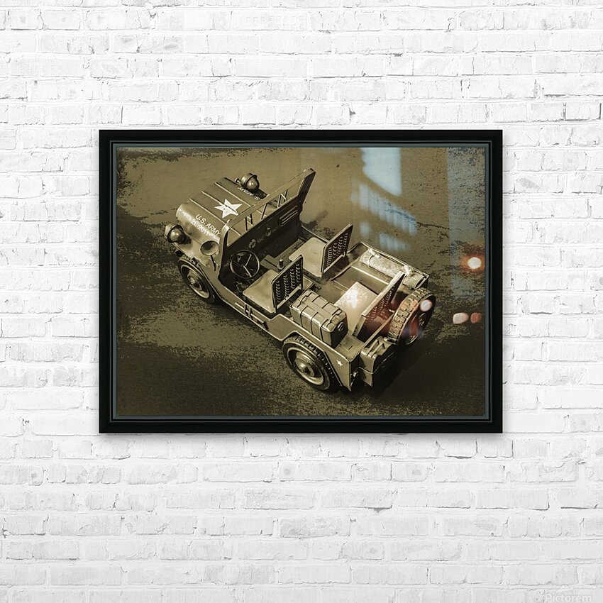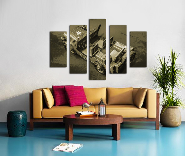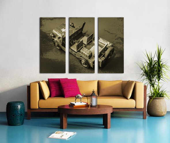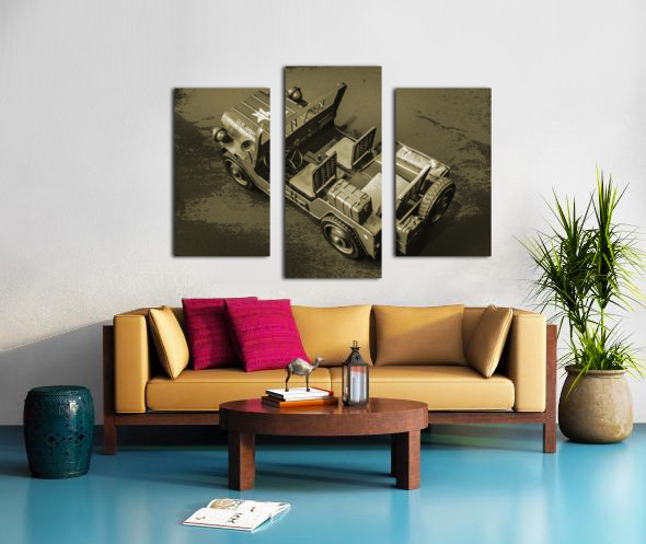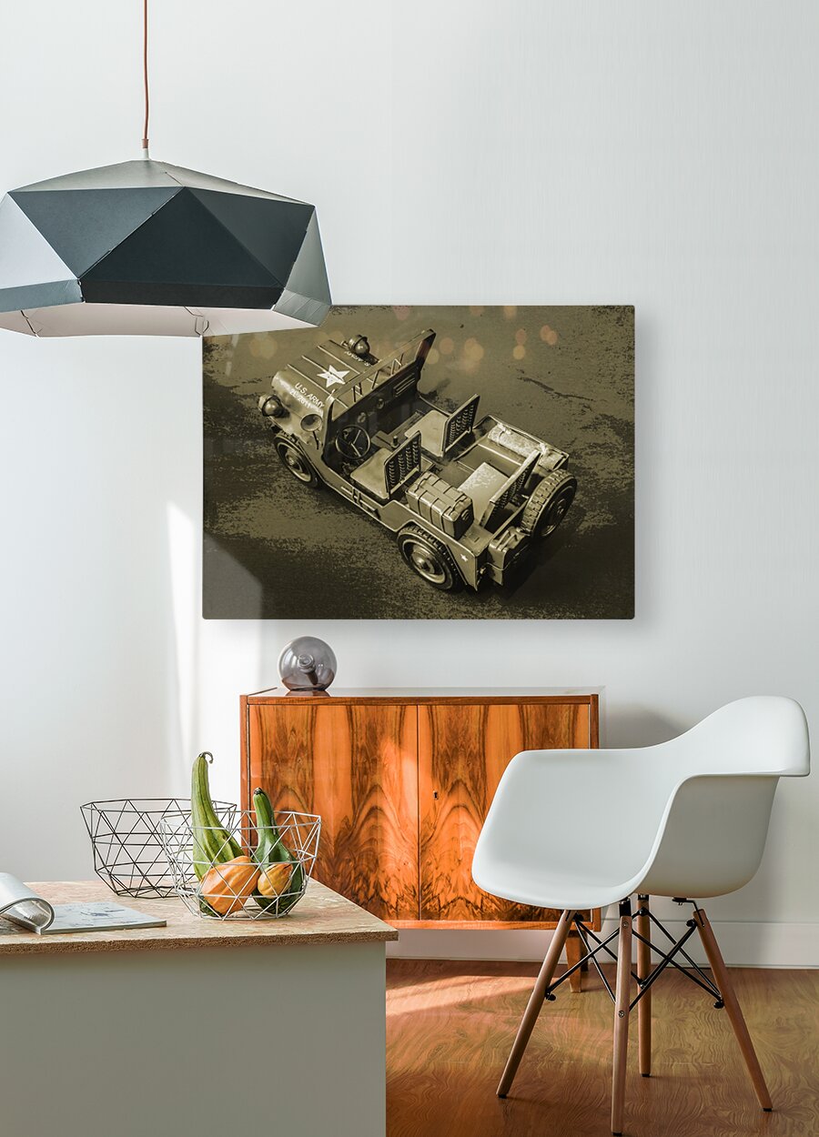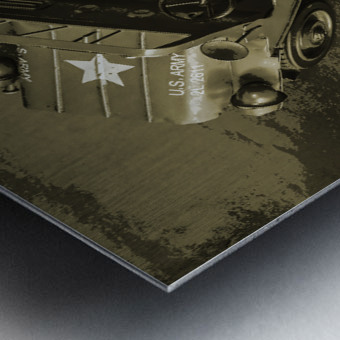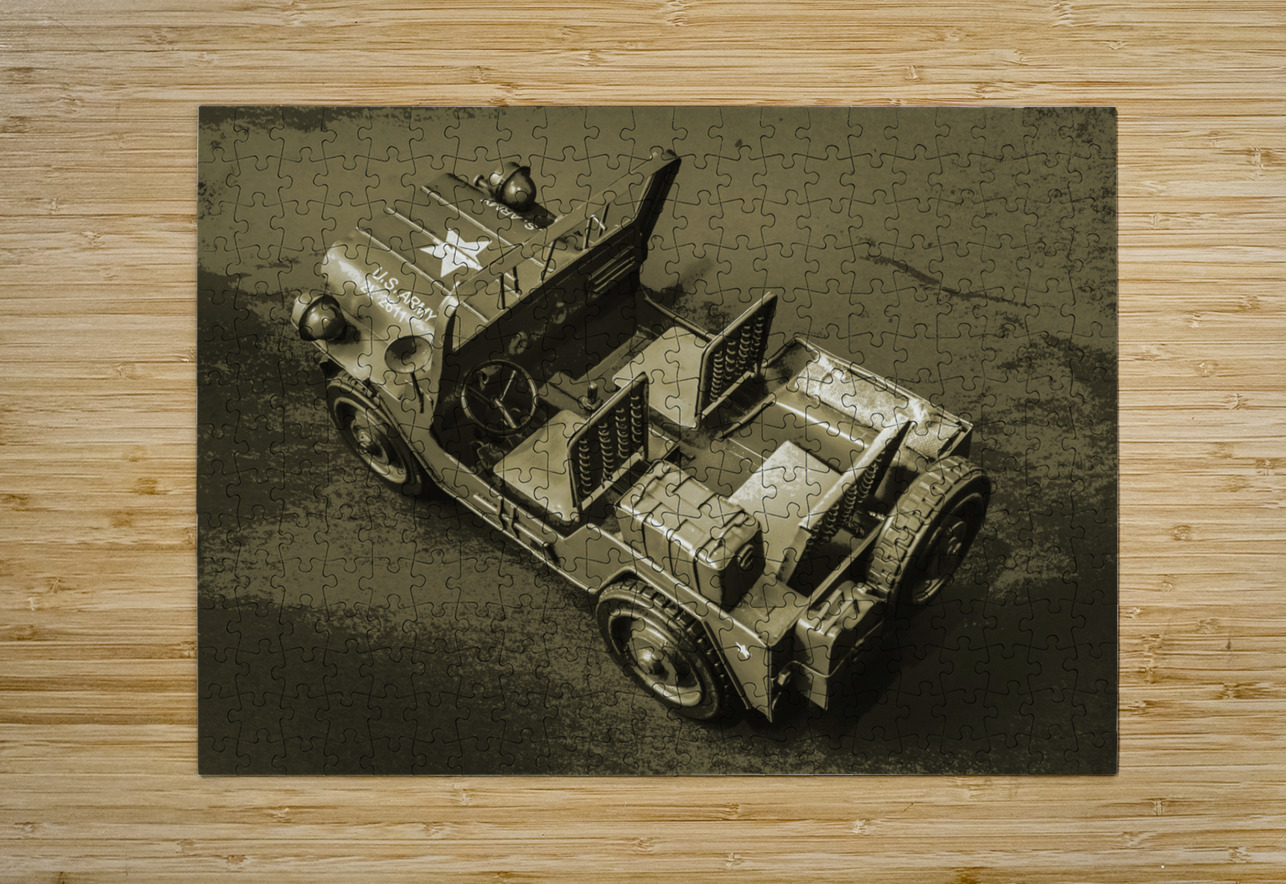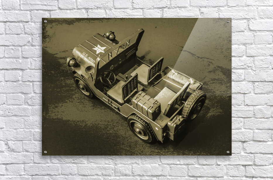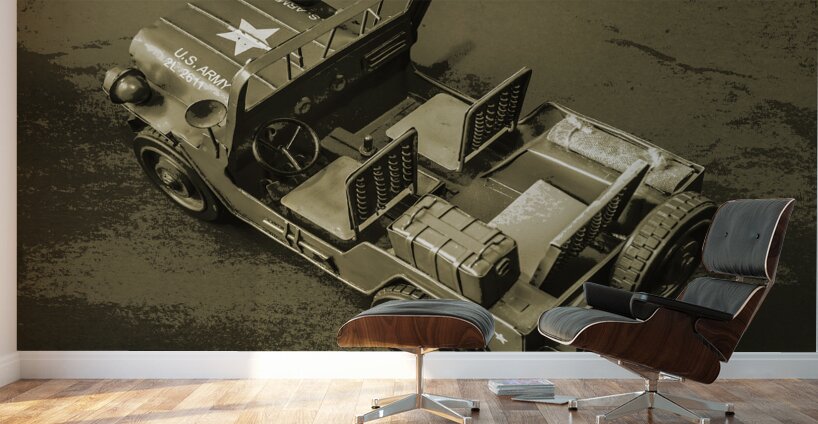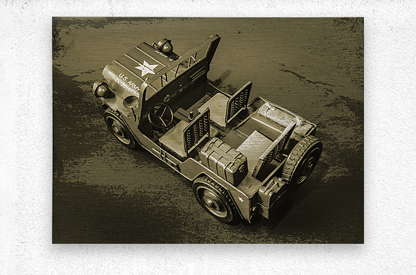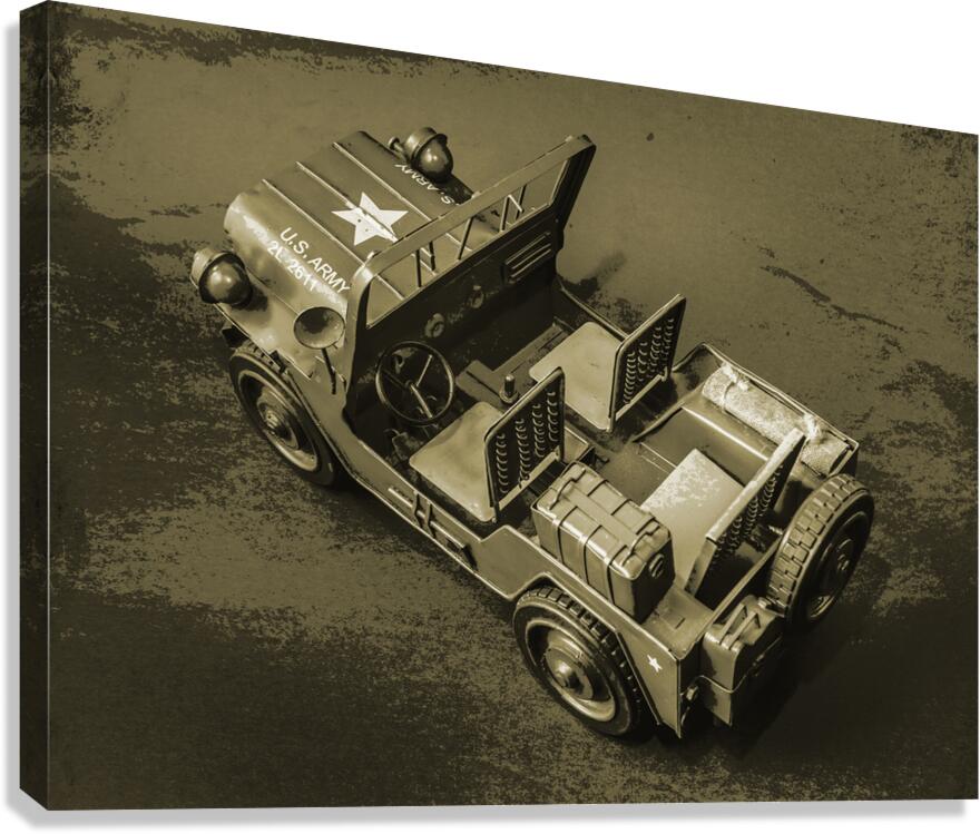 Old-fashioned auto artwork on a military model truck in historic tones. Weathered defender