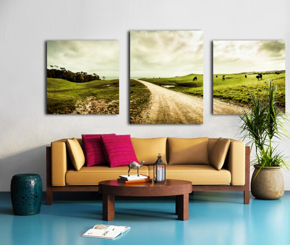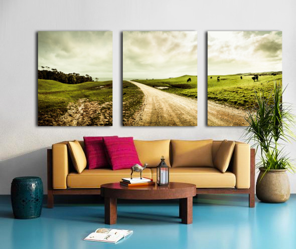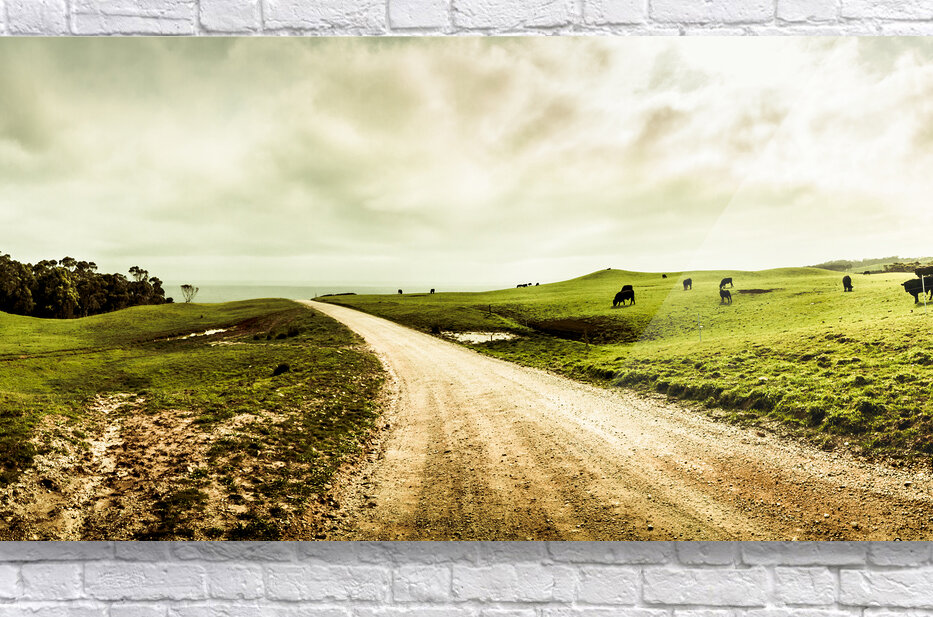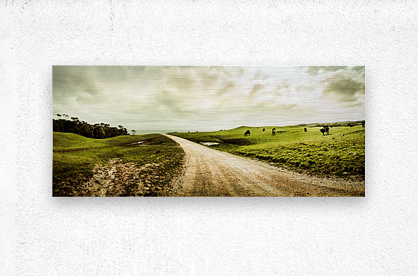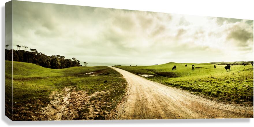 Harmonious rural panorama roadway with cloudy skies and agricultural animals. Granville Harbour West-Coast Tasmania Australia