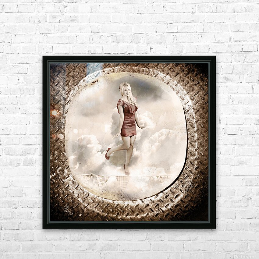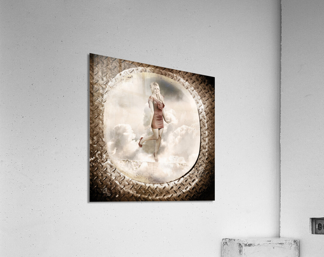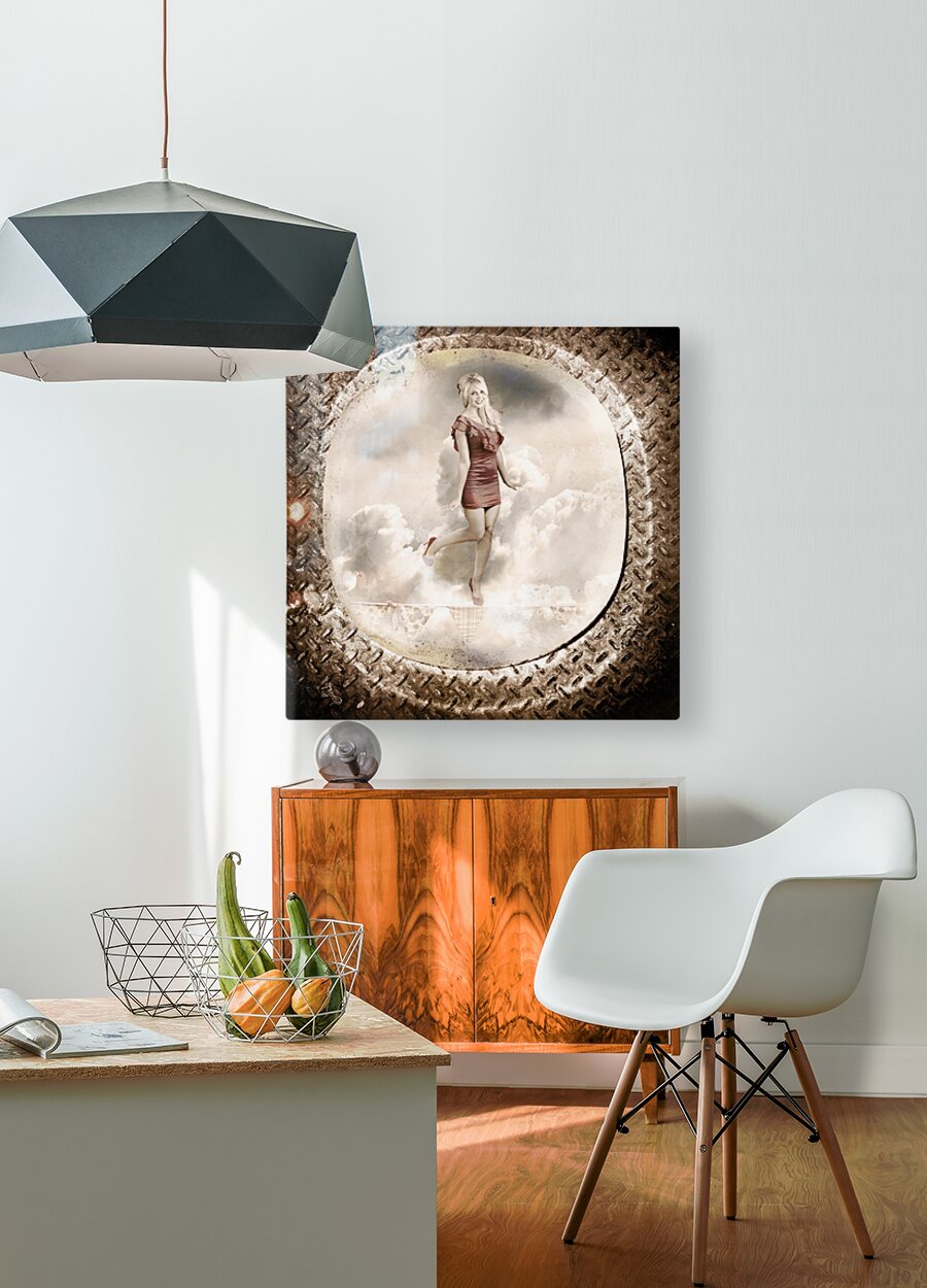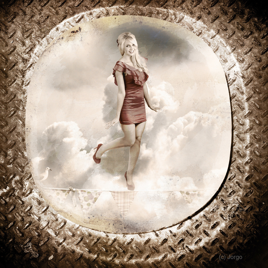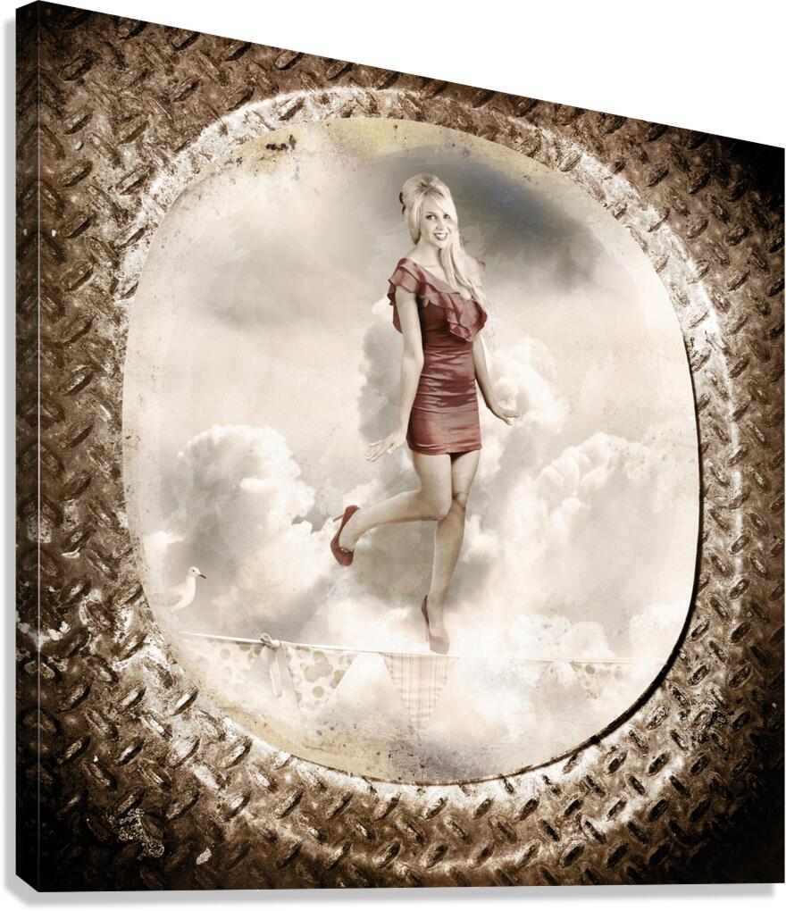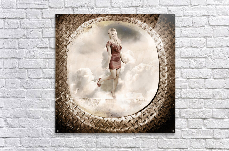 Grunge military portrait taken from a vintage plane window of a retro pin-up woman balancing on a decorated flag line. Forties and fifties australian pinup poster girl